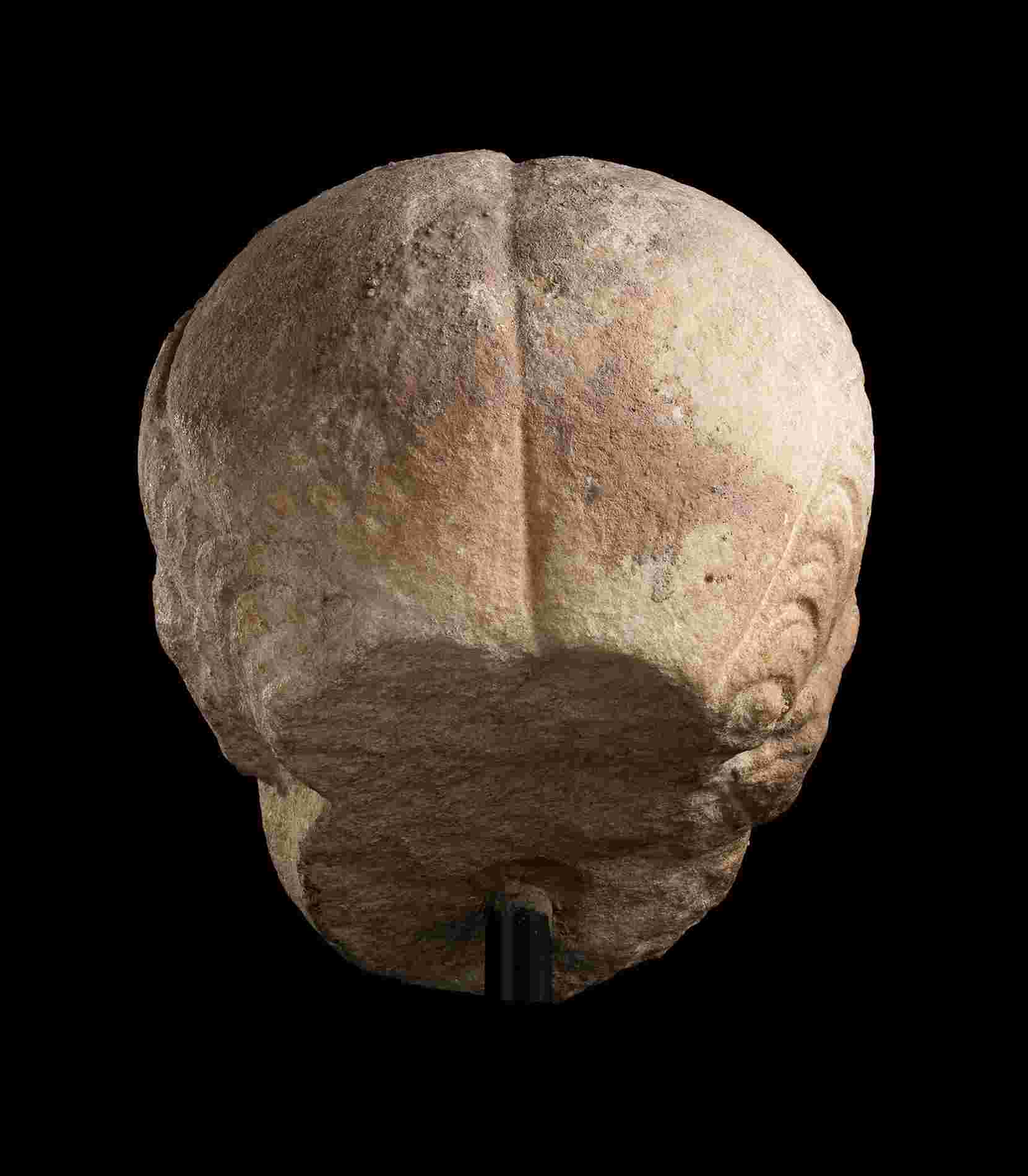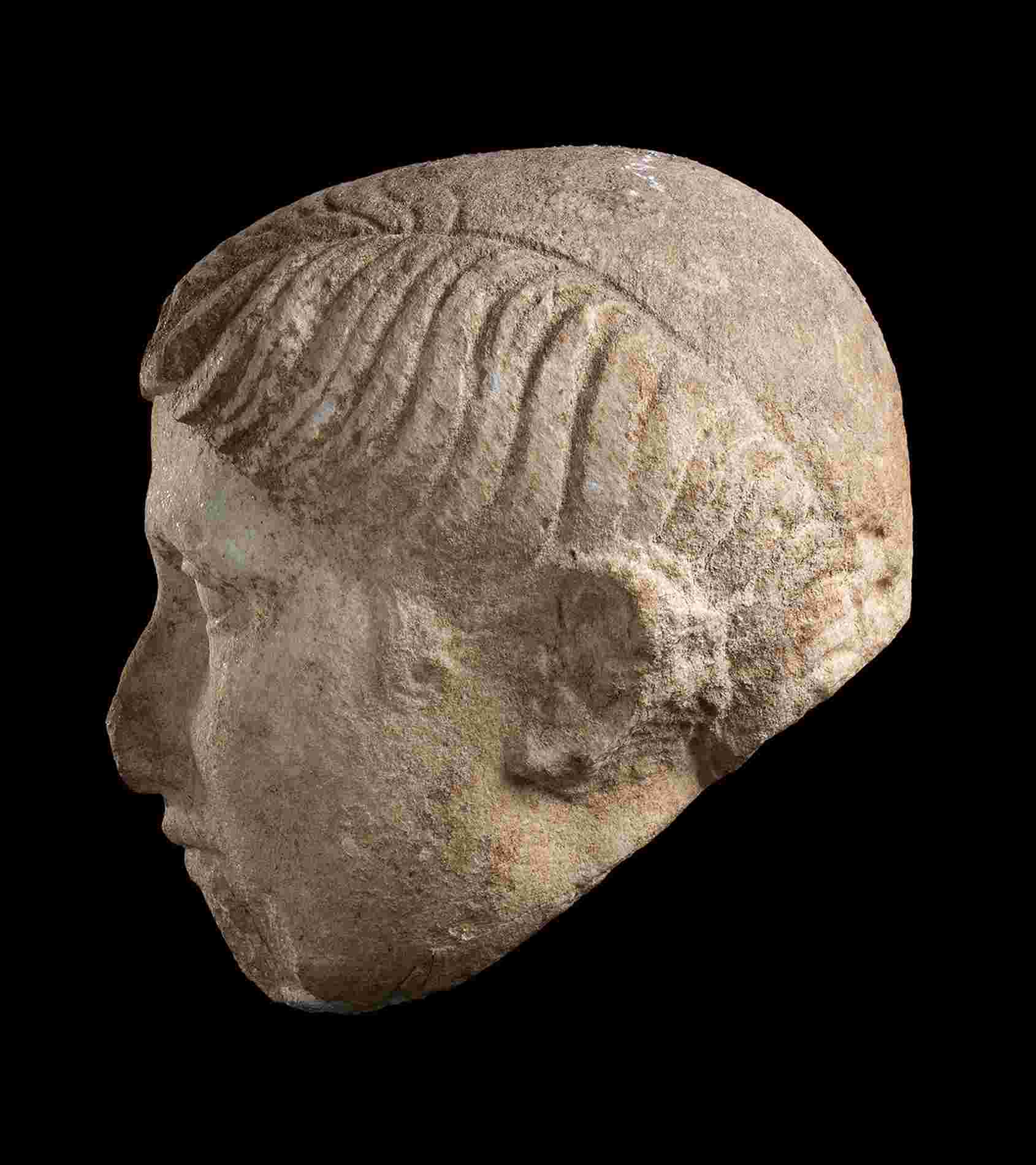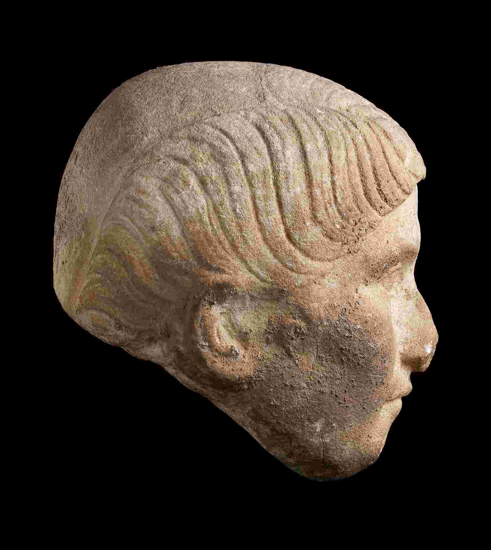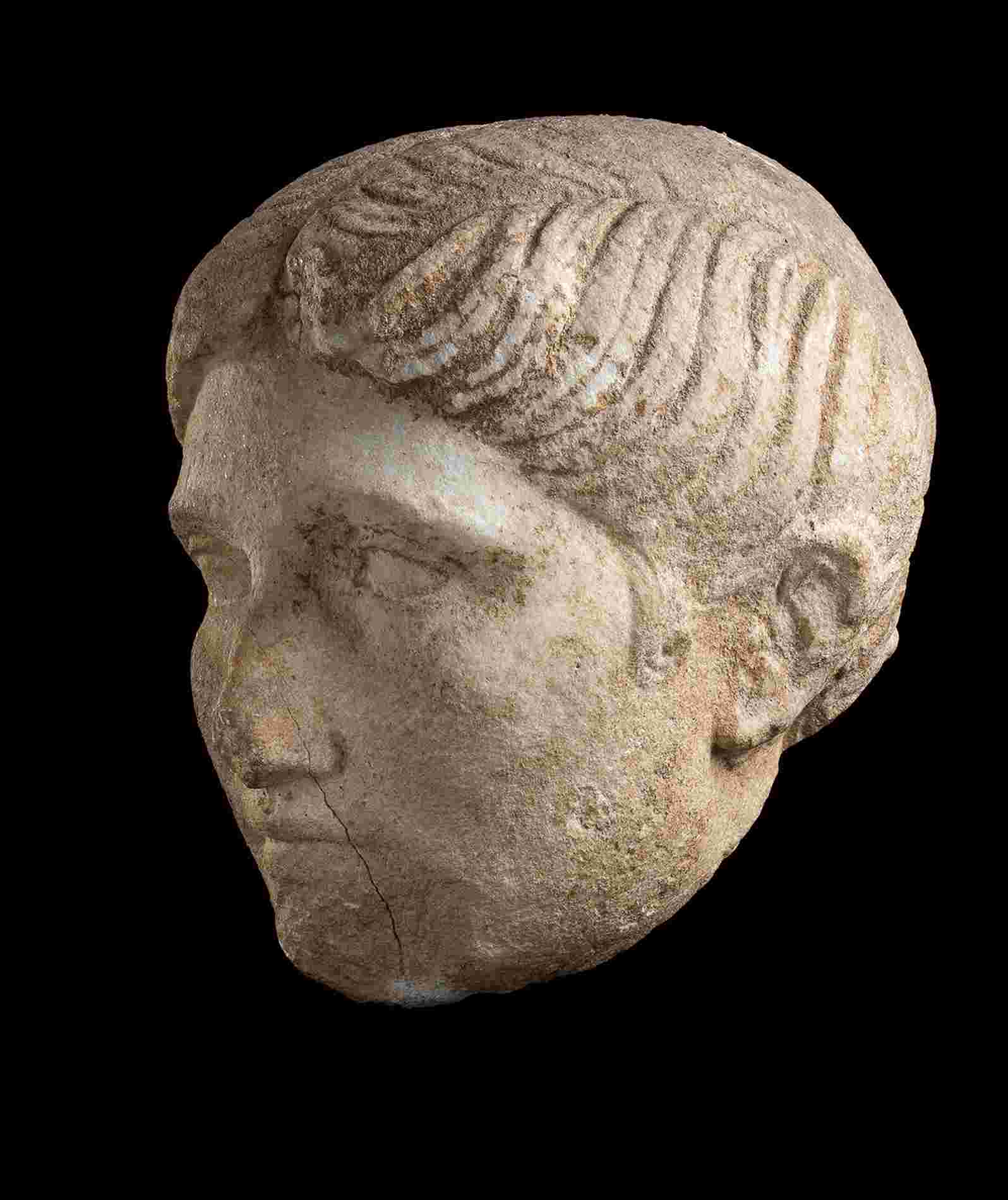 The Roman lady (Matrona) is represented with the oval face characterized by rounded chin and slightly-full lips. The eyes are framed by thin modelled brows, arching gracefully and merging with the bridge of her nose. On the short forehead, the wavy hairs are center parted, with the individual strands delineated, which are elegantly pulled back to the nape, in origin probably collected in a chignon. The head is rendered with great restraint and an admirable mixture of realistic and idealized forms, recalling the expressions of beauty in vogue during the late Augustan time and the first decades of Julio-Claudian period. Provided with a museal stand.