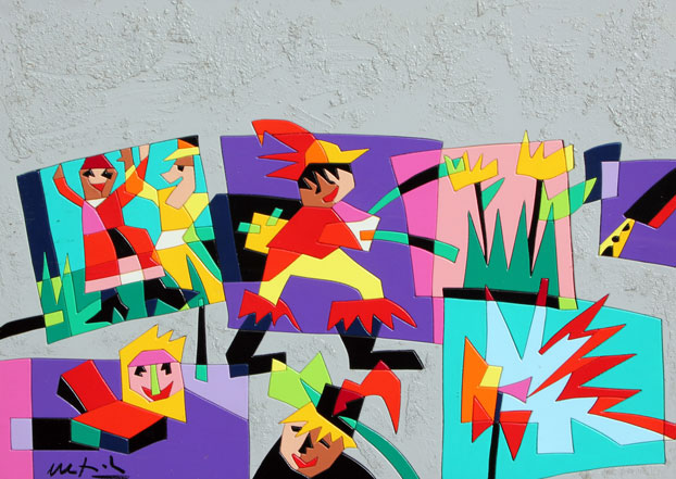 NESPOLO Ugo (Mosso Santa Maria (Bi) 1941) Fairy-tale acrilici su legno, cm. 48.5 x 68.5 Firma 'Nespolo' (in basso a sinistra) #Titolo, tecnica, misure 'Fairy-tale, acrilici su legno, cm. 50x70'; #timbro dell'artista (sul retro)