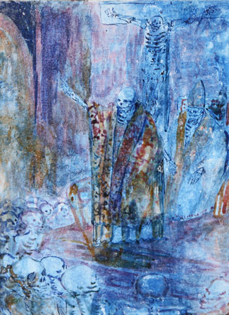 SASSU Aligi (Milano, 1912 - Pollença, 2000) La predica agli scheletri, 1943 tecnica mista su carta applicata su cartoncino, cm. 32 x 22.5 Autentica dell'artista su fotografia Firma 'Sassu' (in basso a destra) #Firma, data, titolo 'Aligi Sassu, 1943, La predica agli scheletri' (al retro)