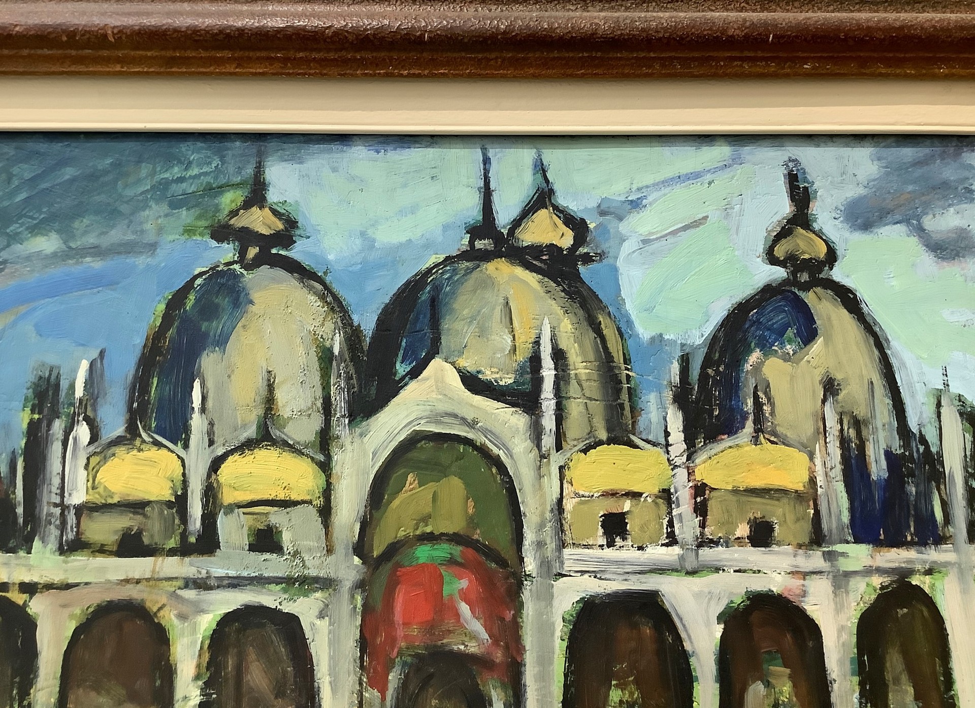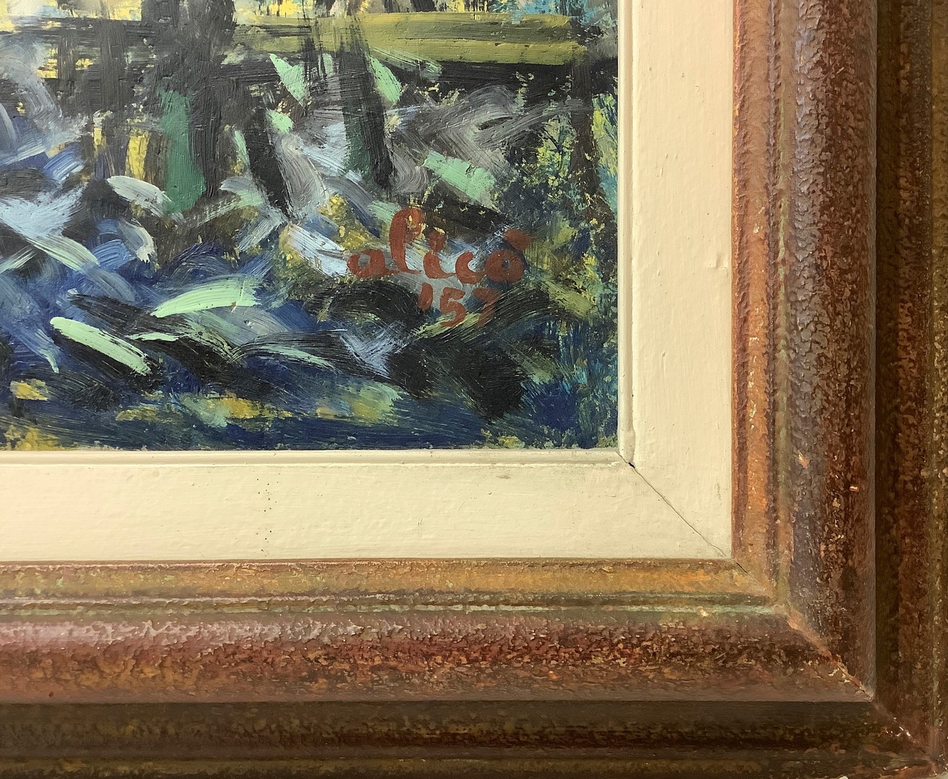 Giovanni Alicò (Catania 1906-Milano 1971) - Venezia, Piazza San Marco, 1957 55x65 cm, in cornice 69x78 cm Dipinto a olio su tavola Giovanni Alicò nasce a Catania nel 1906. Pittore autodidatta, il suo approccio all'arte è libero da vincoli o binari precostruiti. Nel 1935 si stabilisce prima a Napoli poi a Milano. Nel 1942 è presente con un'opera alla XXIII Biennale di Venezia,e nello stesso anno, tiene la sua prima mostra personale alla Galleria Tornabuoni di Firenze. Seguono, tra il 1948 e il 1953, sei anni di attività in Argentina,con tre personali a Buenos Aires e molte partecipazioni a collettive in diversi saloni nazionali nelle città di La Rioja, Santa Fè, Mendoza e Rosario. Rientrato in Italia, dalla metà degli anni Cinquanta e per tutto il decennio successivo diverse furono le sue personali a Catania, Milano, Roma e Como. E' stato Premio Suzzara nel 1955 con l'opera Contadino che riposa, dove il pittore, svincolato da una fredda descrizione realistica e lontano dagli schemi neocubismo tipici del primo dopoguerra, si abbandona ad una pittura di suggestione luministica, dalle larghe campiture di verdi, di grigi, di terre, sostenuta da una densa materia pittorica definita da una spessa linea di contorno. Il dipinto è attualmente conservato nella Galleria Civica d'Arte Contemporanea di Suzzara. Nel 1957 ha esposto alla Galleria il Pincio a Piazza del Popolo a Roma, una delle realtà più attive nel panorama delle mostre d'arte, dove vi esponevano anche Renato Guttuso e Carla Accardi. Ha iniziato il suo percorso artistico raffigurando nella sua pittura i carretti con le colorite storie dei pupi utilizzando tinte preferibilmente piatte, successivamente introduce nella sua tavolozza cromie delicate,vibranti,e si concentra su temi pervasi da una marcata spiritualità. I soggetti favoriti sono figure femminili, nature morte e paesaggi. Negli Anni Cinquanta Giovanni Alicò avvicina il suo stile a quello di Guttuso, nell'ambito del realismo sociale. La sua attenzione è verso una pittura figurativa sintetica,che procede per suggestioni nella generale aderenza ai temi del realismo sociale. Dopo il 1960 entra nella sua opera un’importante poetica fatta di arabeschi e effetti luminosi e cromatici mobilie sfumati. Dal 1967 compaiono su tali sfondi personaggi antropomorfi, sorta di fantasmi,che si librano nello spazio della composizione. La produzione ultima dell'artista è invece caratterizzata da dipinti dove segni, forme geometriche ripetute e ampie macchie di colore sono resi con cromie intense e vivide approdando a esiti di natura informale e materica. Giovanni Alicò muore a Catania nel 1971. Dopo la sua morte, viene allestita una importante retrospettiva al Palazzo della Borsa di Catania nel 1973. Molte delle sue opere sono presenti in importanti collezioni private in Europa e in America e in diverse fondazioni d'arte.