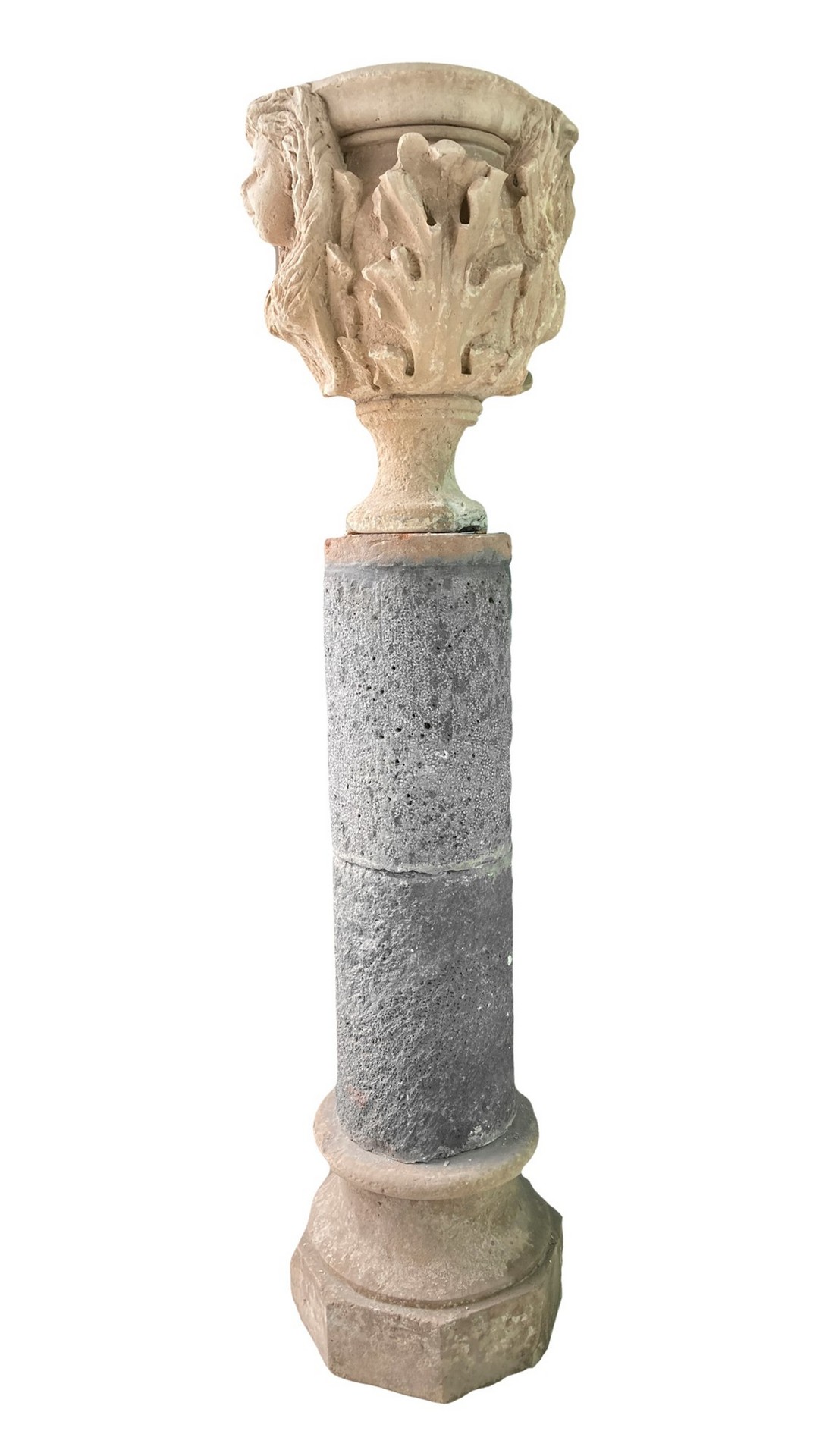 Coppia di colonne, sormontate da vasi del XVII secolo, raffiguranti donna e acquila, 17° secolo H cm 165 Pietra lavica e pietra arenaria del Val di Noto scolpite Ogni pilastro si erge su una base composta da plinto, toro e scozia, rispettando i canoni architettonici delle basi attiche. Il fusto di ogni pilastro è diviso in due rocchi; lungo la parte sommitale è poggiato un vaso adornato da sculture a basso rilievo: uno di essi raffigura un volto femminile, mentre il secondo mostra l'immagine di un'aquila.