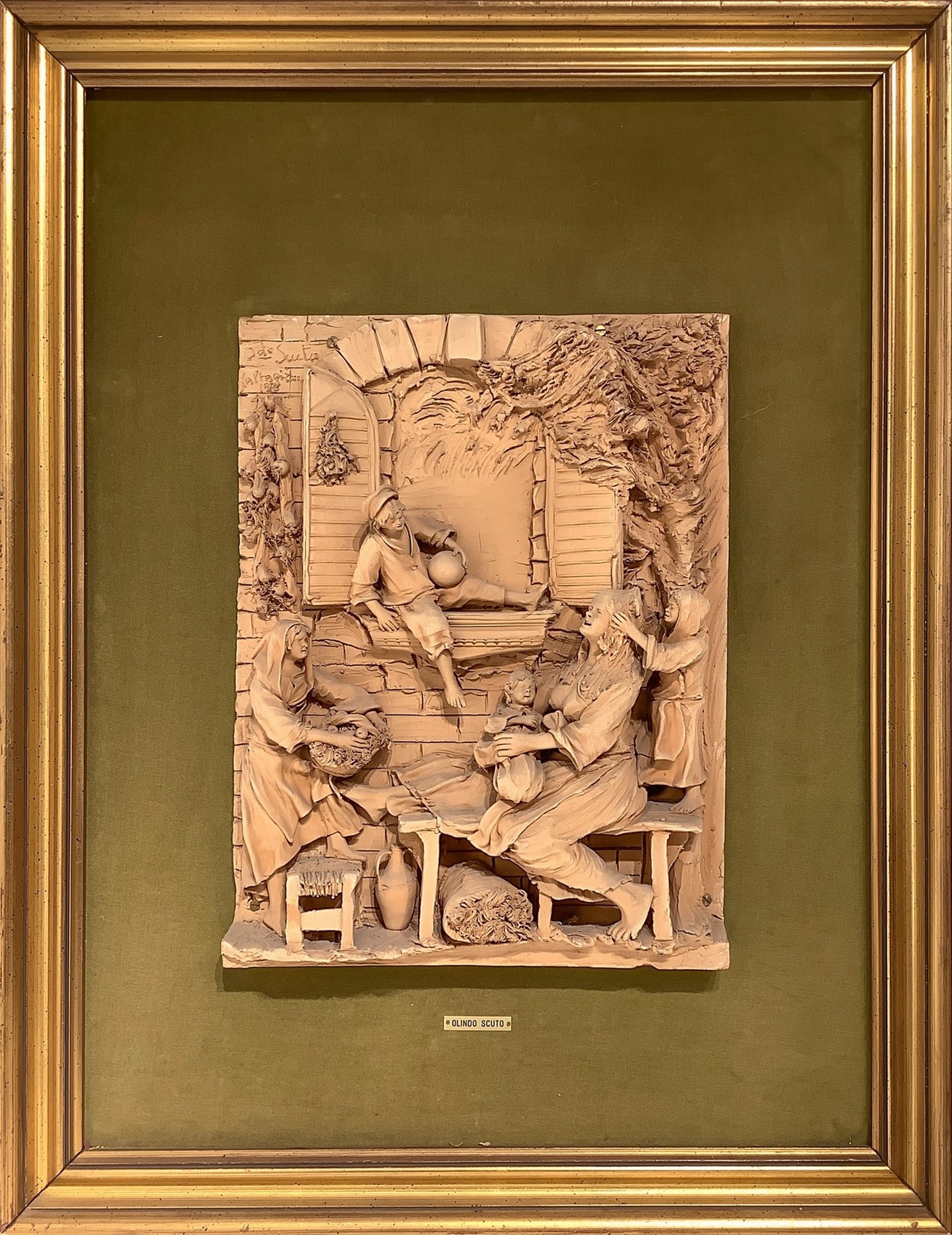 Olindo Scuto (Catlagirone 1921-2017) - Altorilievo in terracotta con cinque personaggi 48x35 cm, in cornice 90x70 cm