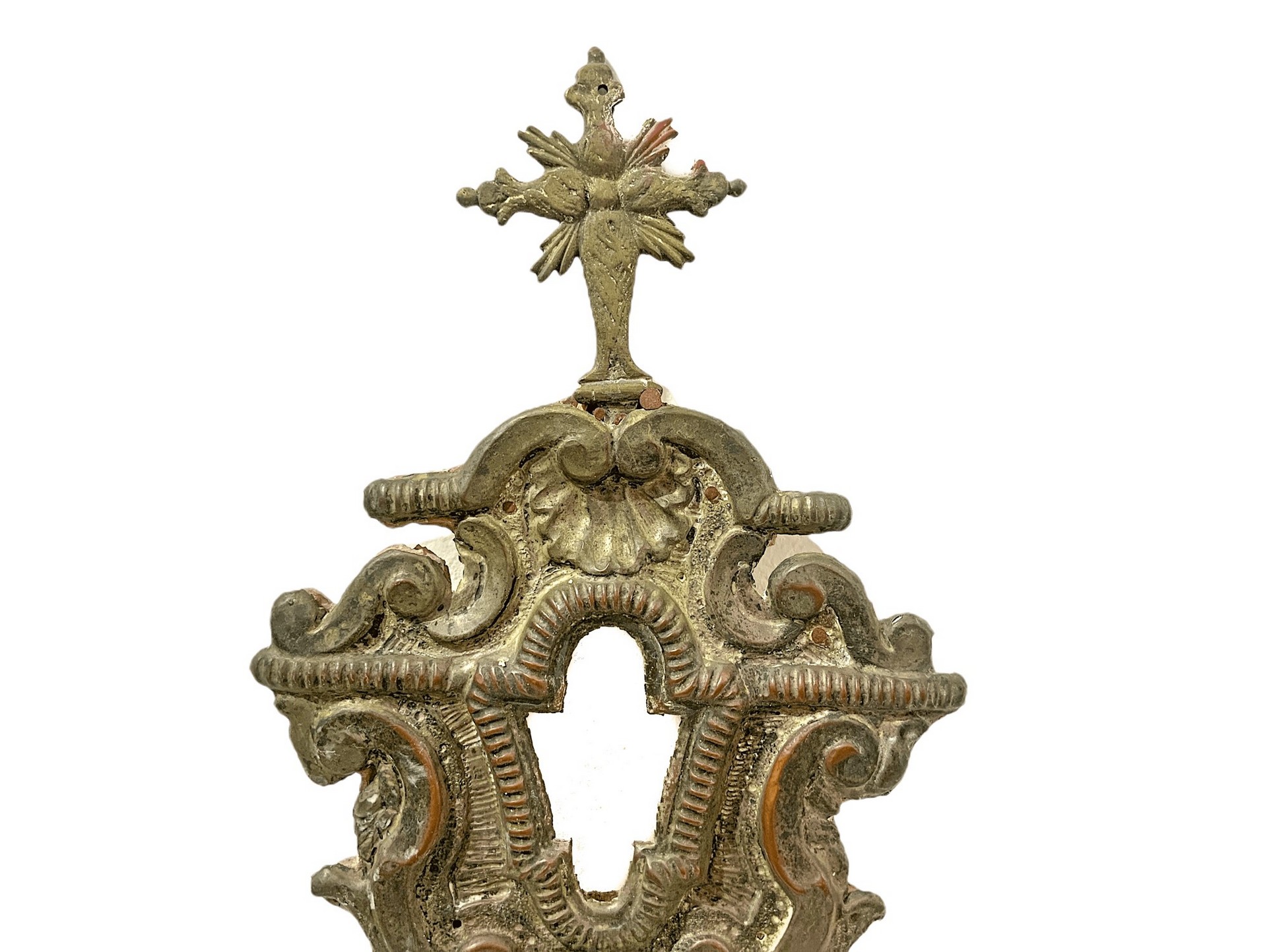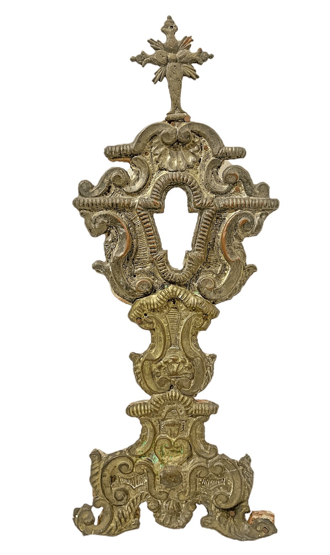 Ostensorio in legno, ricoperto in ottone sbalzato a rilievo, 19° secolo