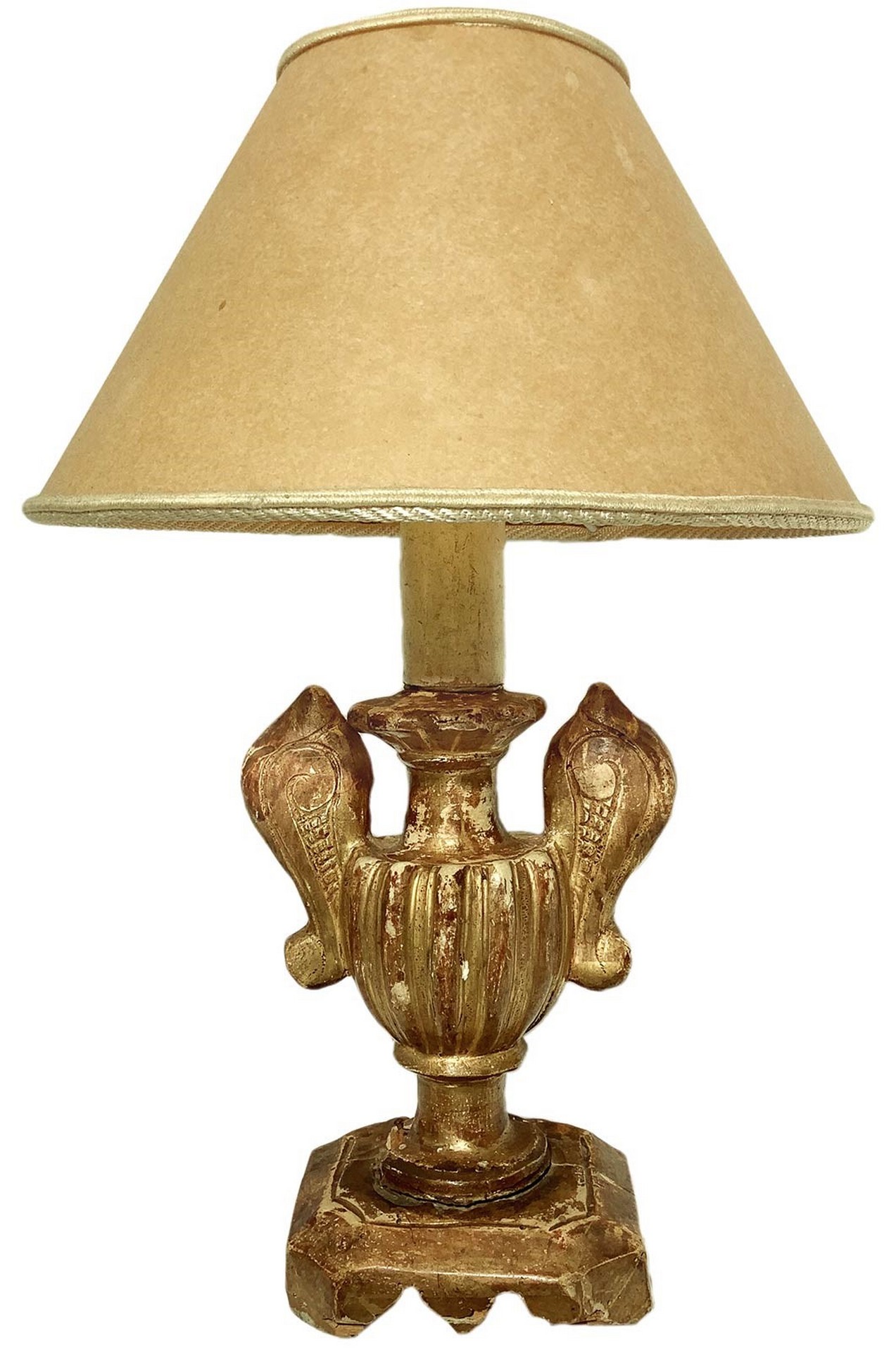 Piccolo lume con base in legno dorato a forma di anfora con paralume in pergamena, 19° secolo