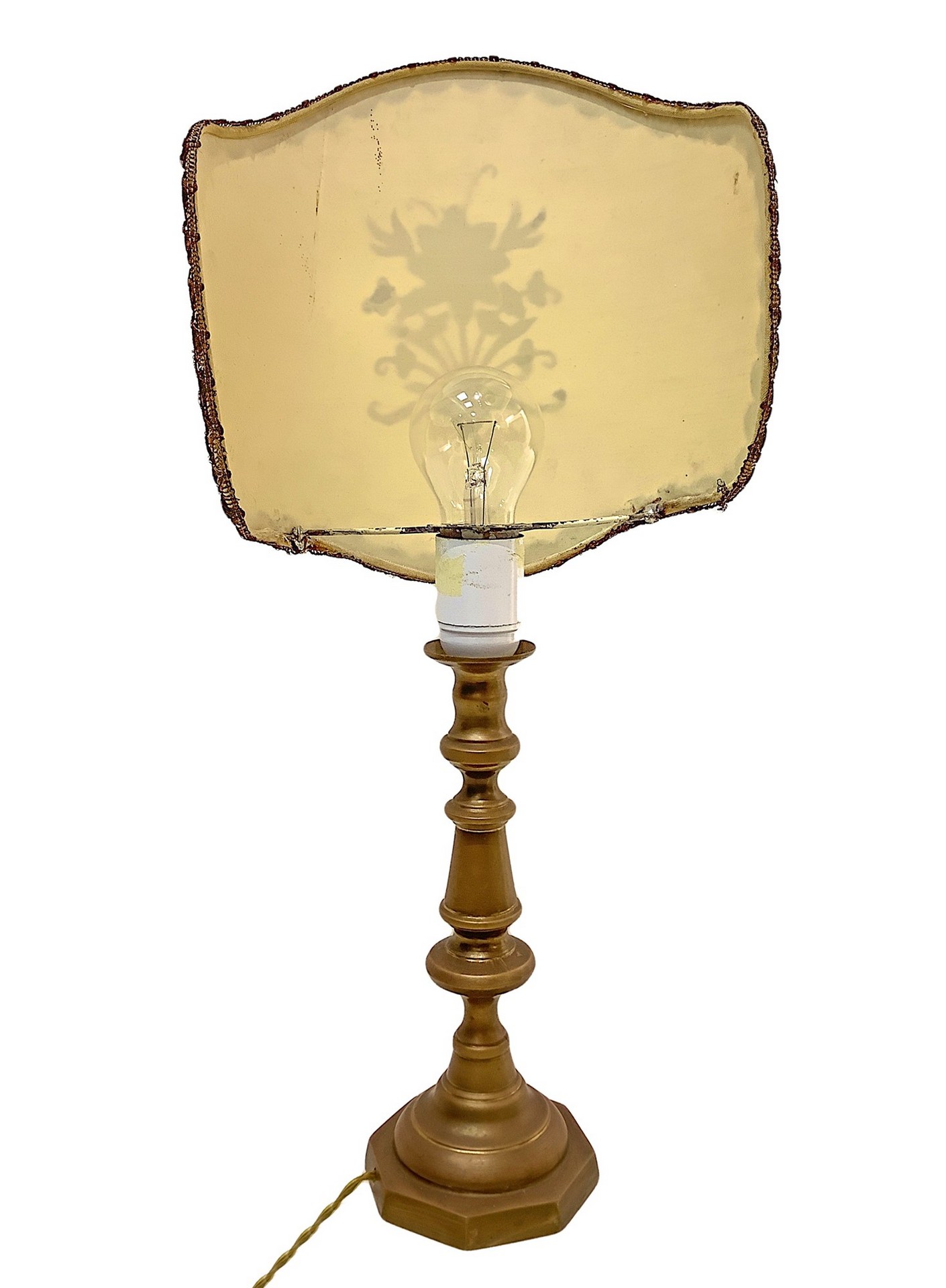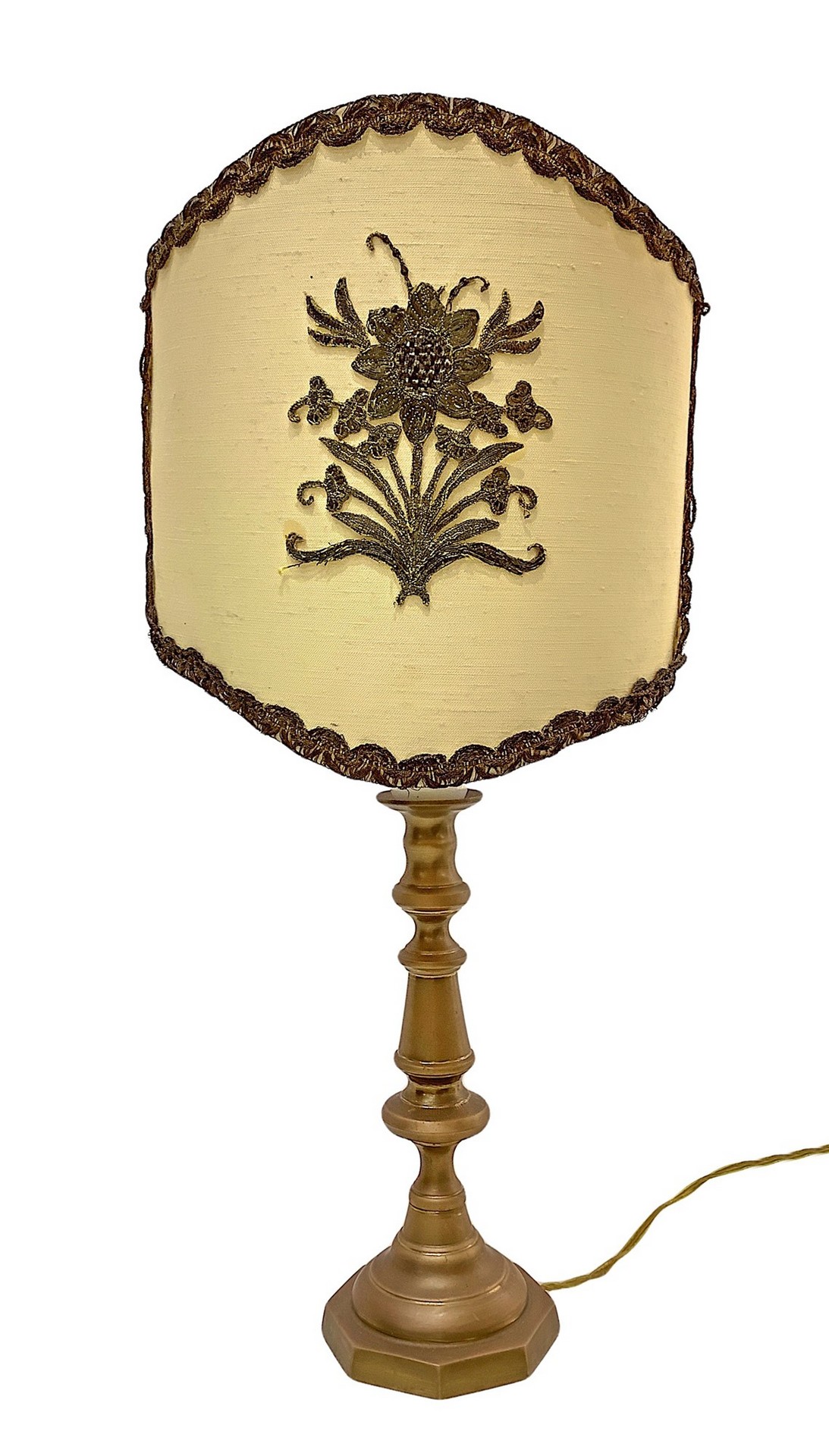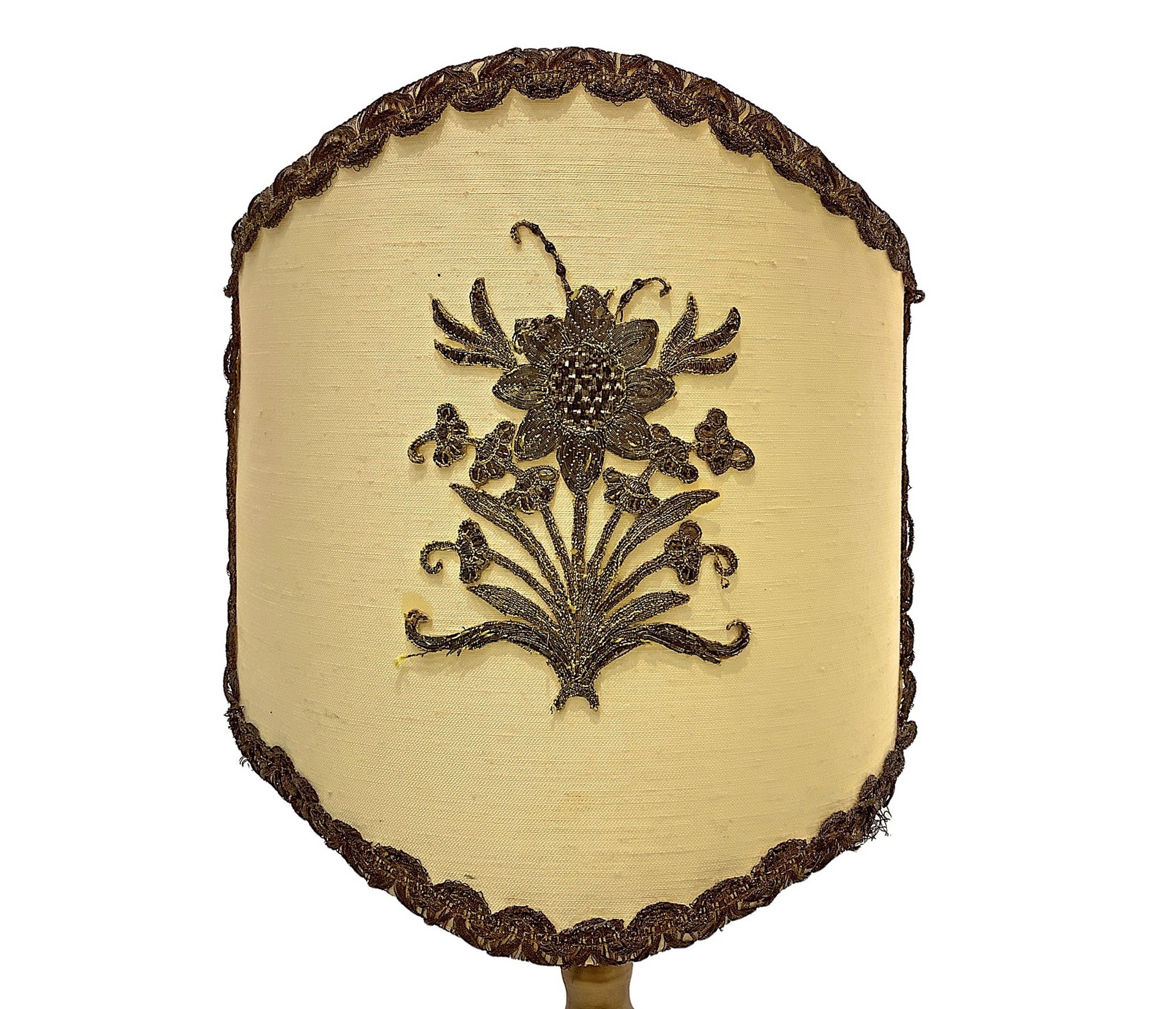 Coppia di lumetti in metallo con ventola in stoffa ricamata, Inizi 20° secolo