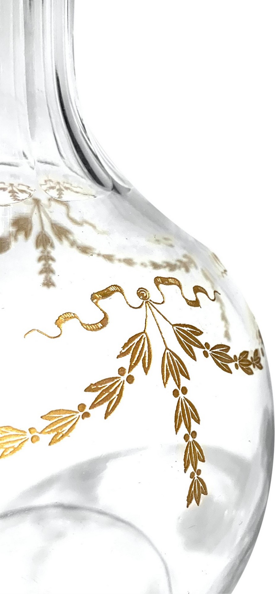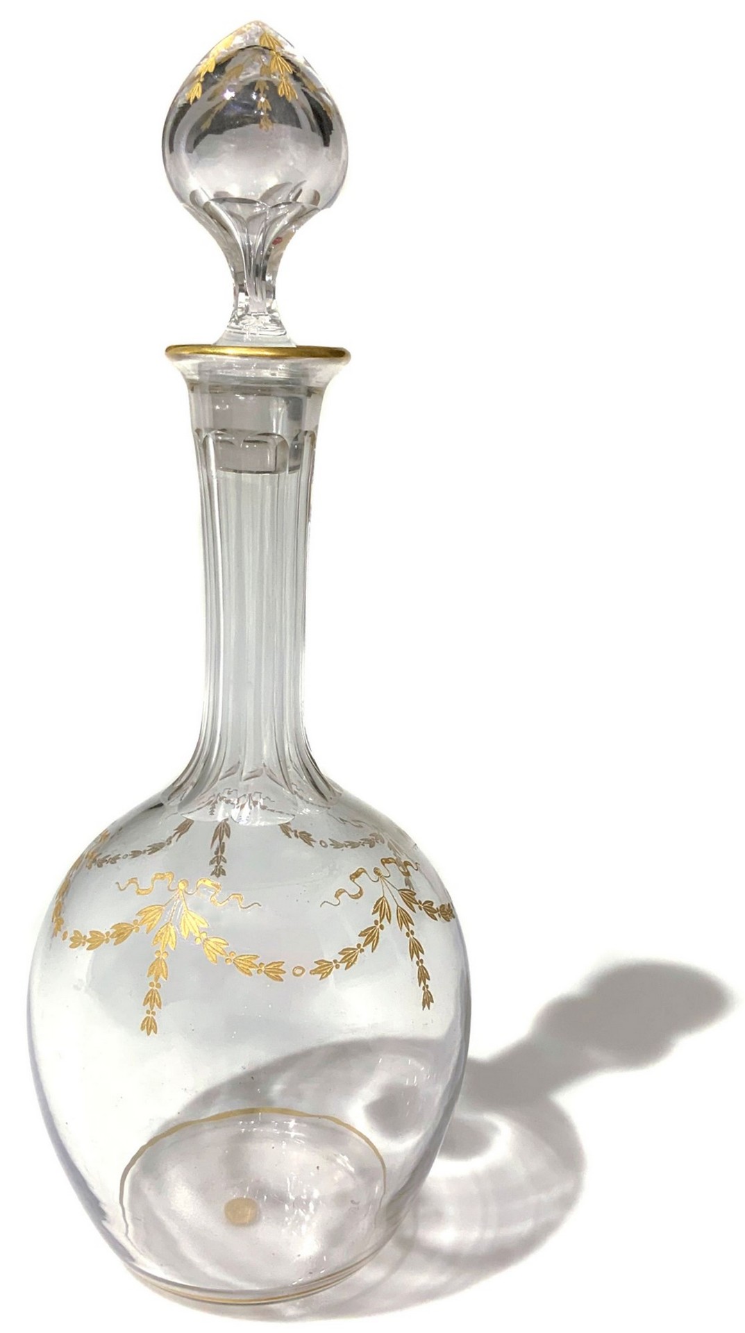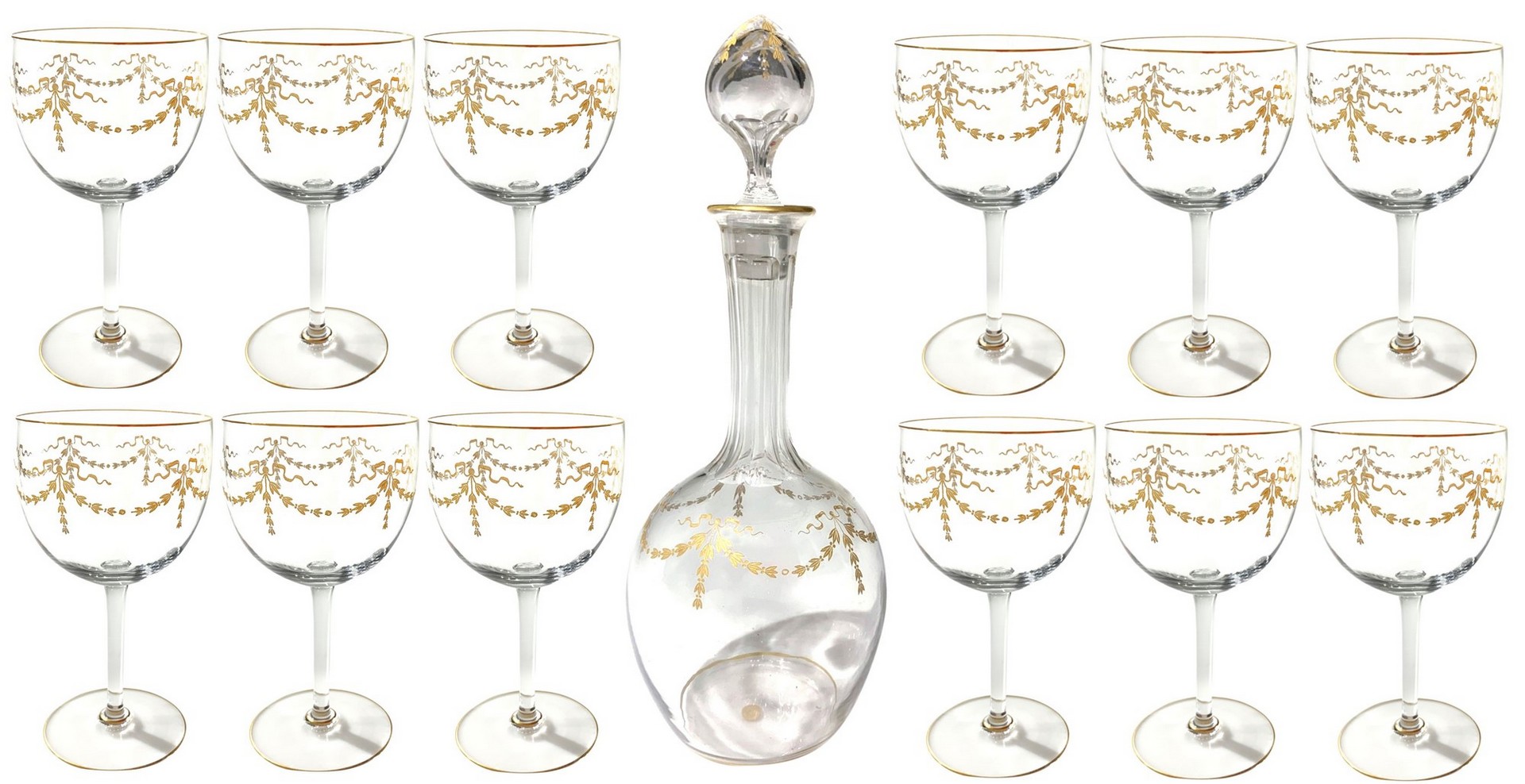 Servizio di bicchieri da vino in cristallo e bicchieri con merletto in colore oro Composto da 1 bottiglia con merletto in colore oro e 12 bicchieri con merletto in colore oro
