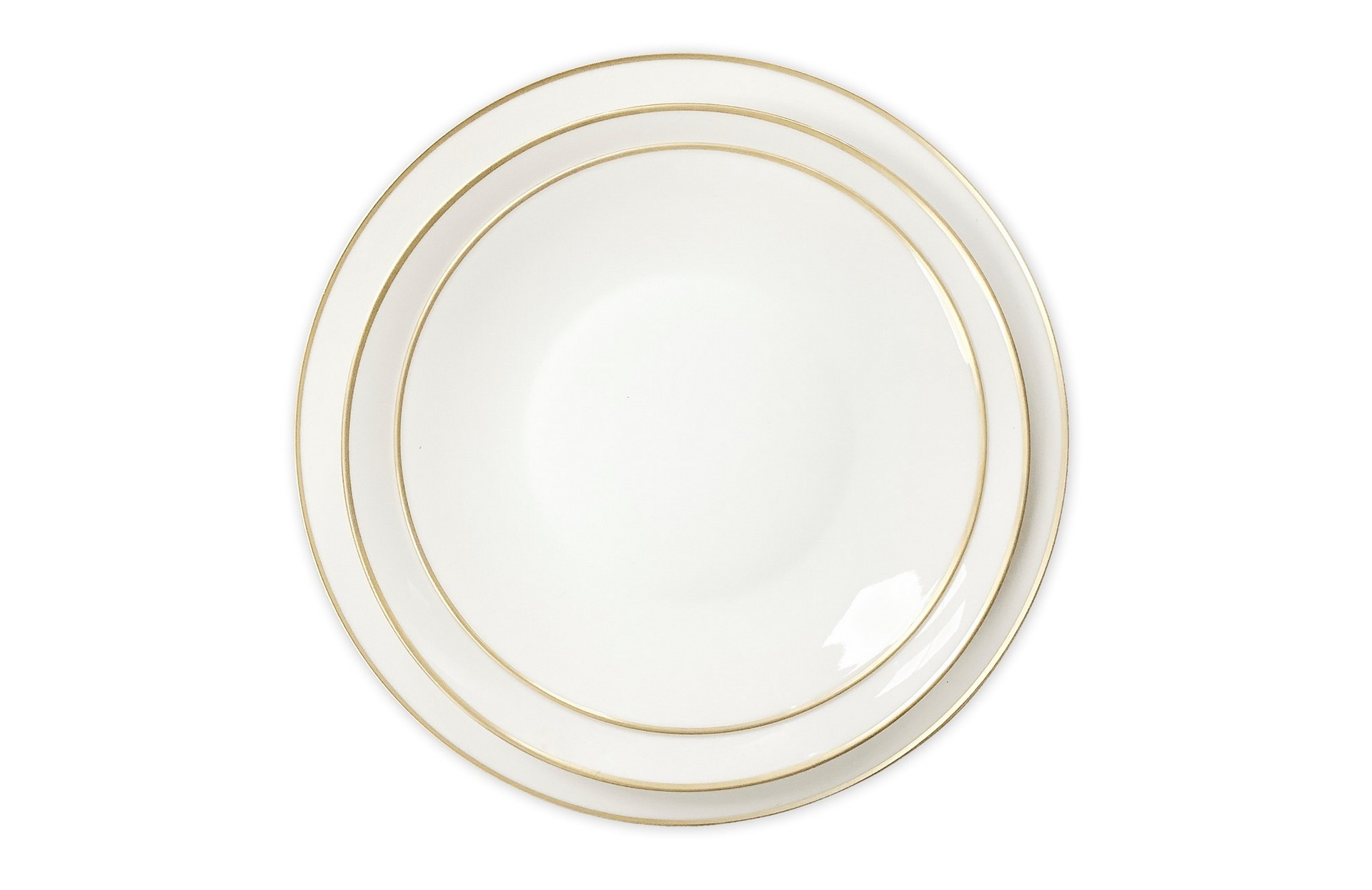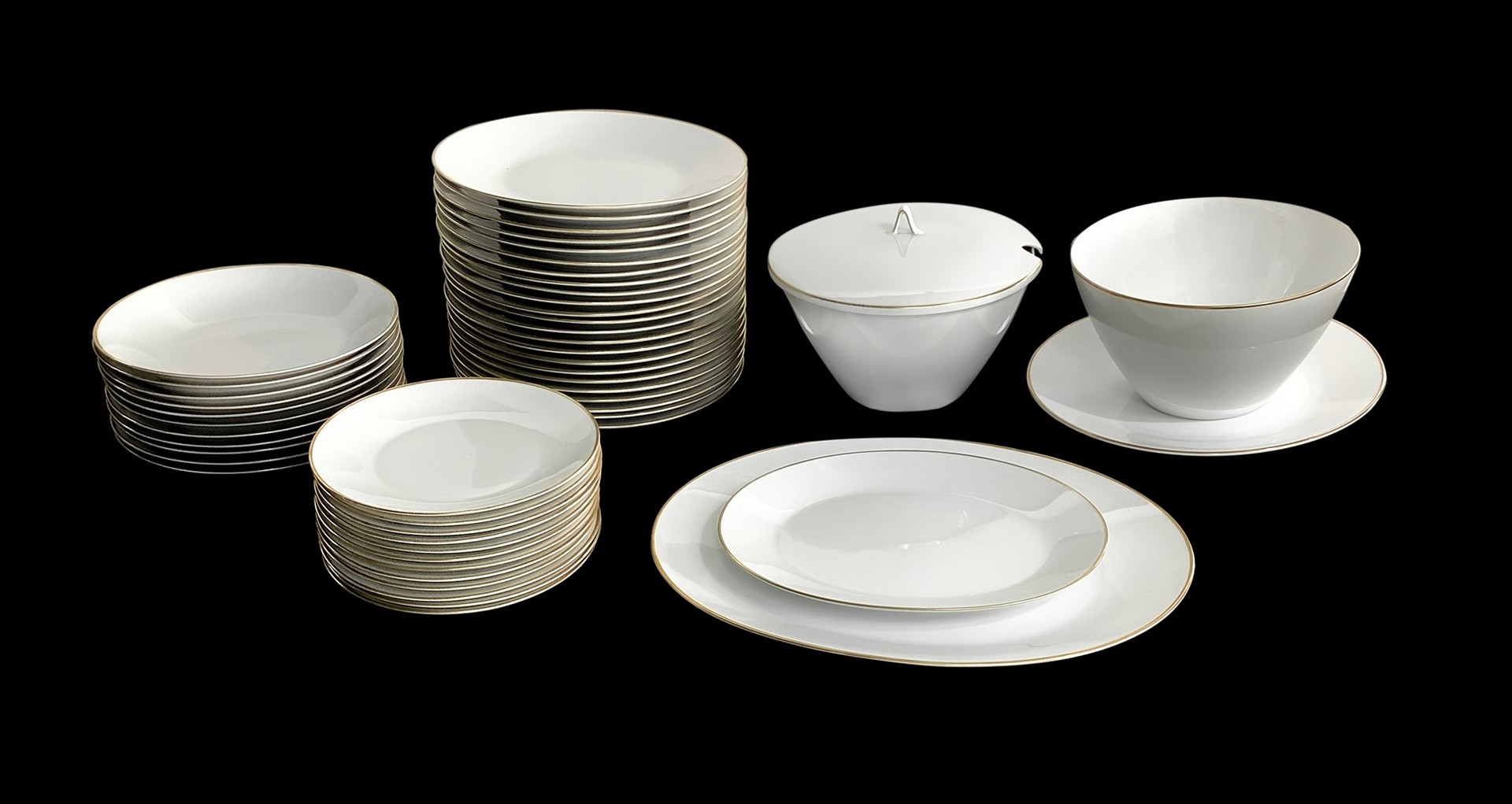 Servizio composto da: 23 piatti piani, 12 piatti frutta, 11 piatti fondi, 1 insalatiera, 1 piatto ovale grande, 1 piatto ovale piccolo, 1 piatto tondo, 1 zuppiera.