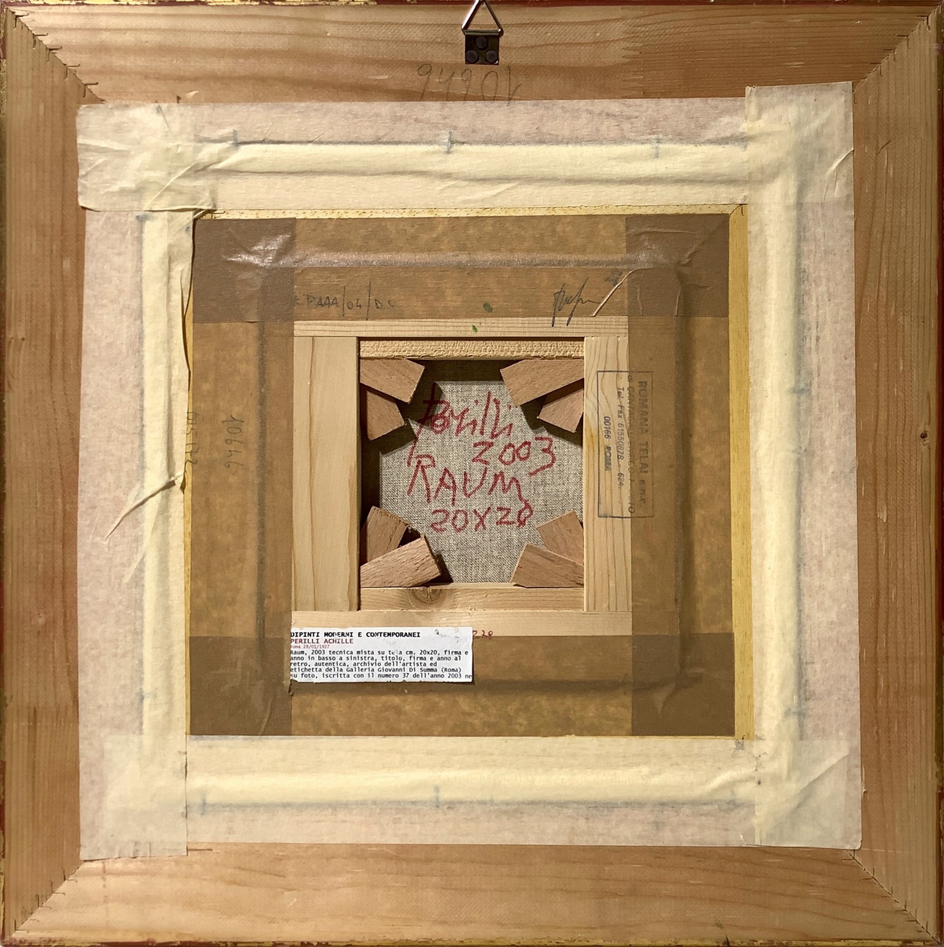 Achille Perilli (Roma 1927-Orvieto 2021) - Raum, 2003 20x20 cm, in cornice 46x46 cm Tecnica mista su tela Opera numero 37 del 2003 del Catalogo Generale. Certificato e firma del pittore tramite la galleria Giovanni Disumma Roma. Firmato in basso a sinistra e datato. Sul retro firmato, datato e titolato Raum.