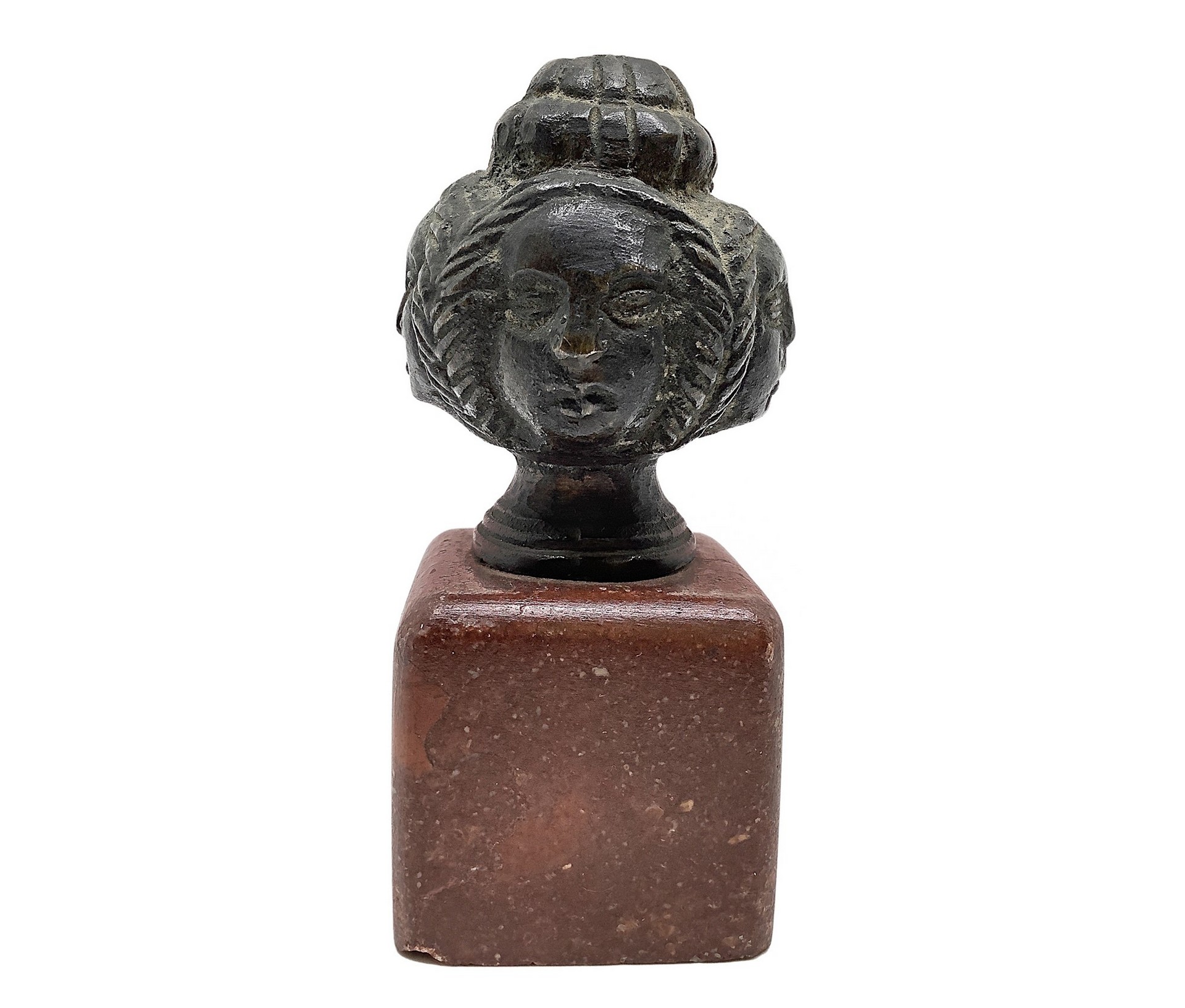 Piccolo bronzo raffigurante 4 volti di donna, XVI secolo H cm 10 Bronzo con base in porfido rosso