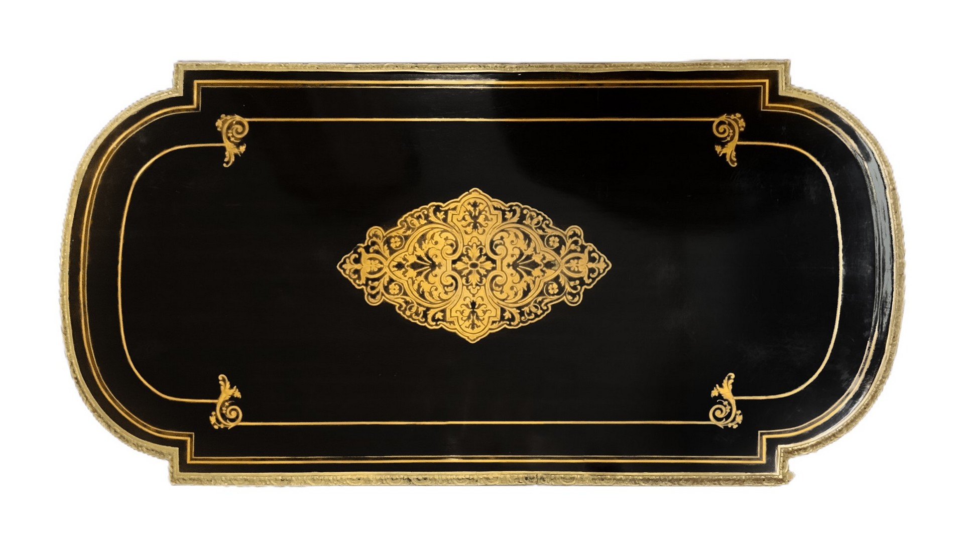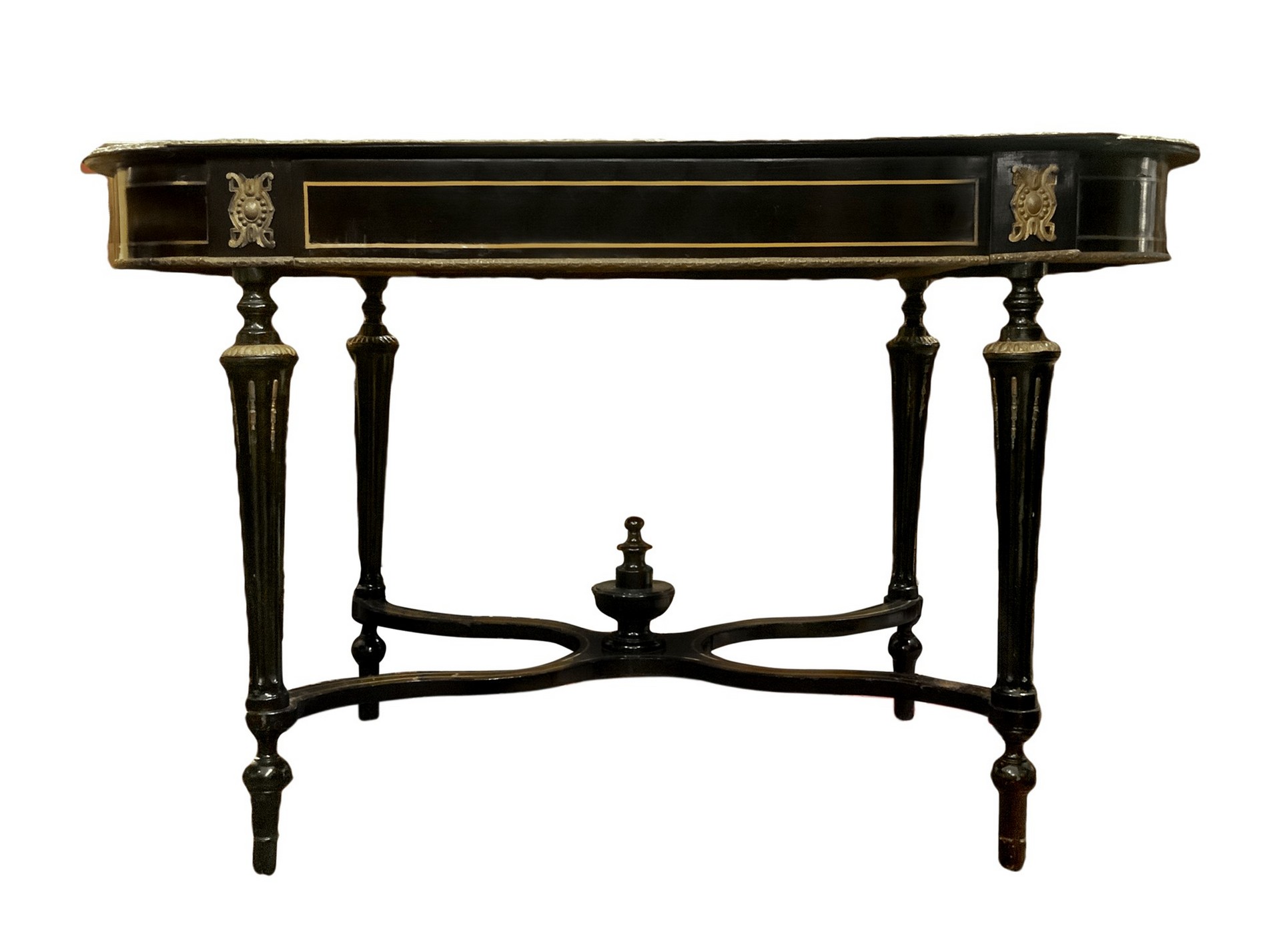 Tavolo da centro in legno nero ebanizzato, cassetto centrale, intarsio centrale al piano in ottone. Applicazioni di bronzo dorato su contorno e perfilato in ottone. Napoleone III. H cm 75x130x70. Ottimo stato