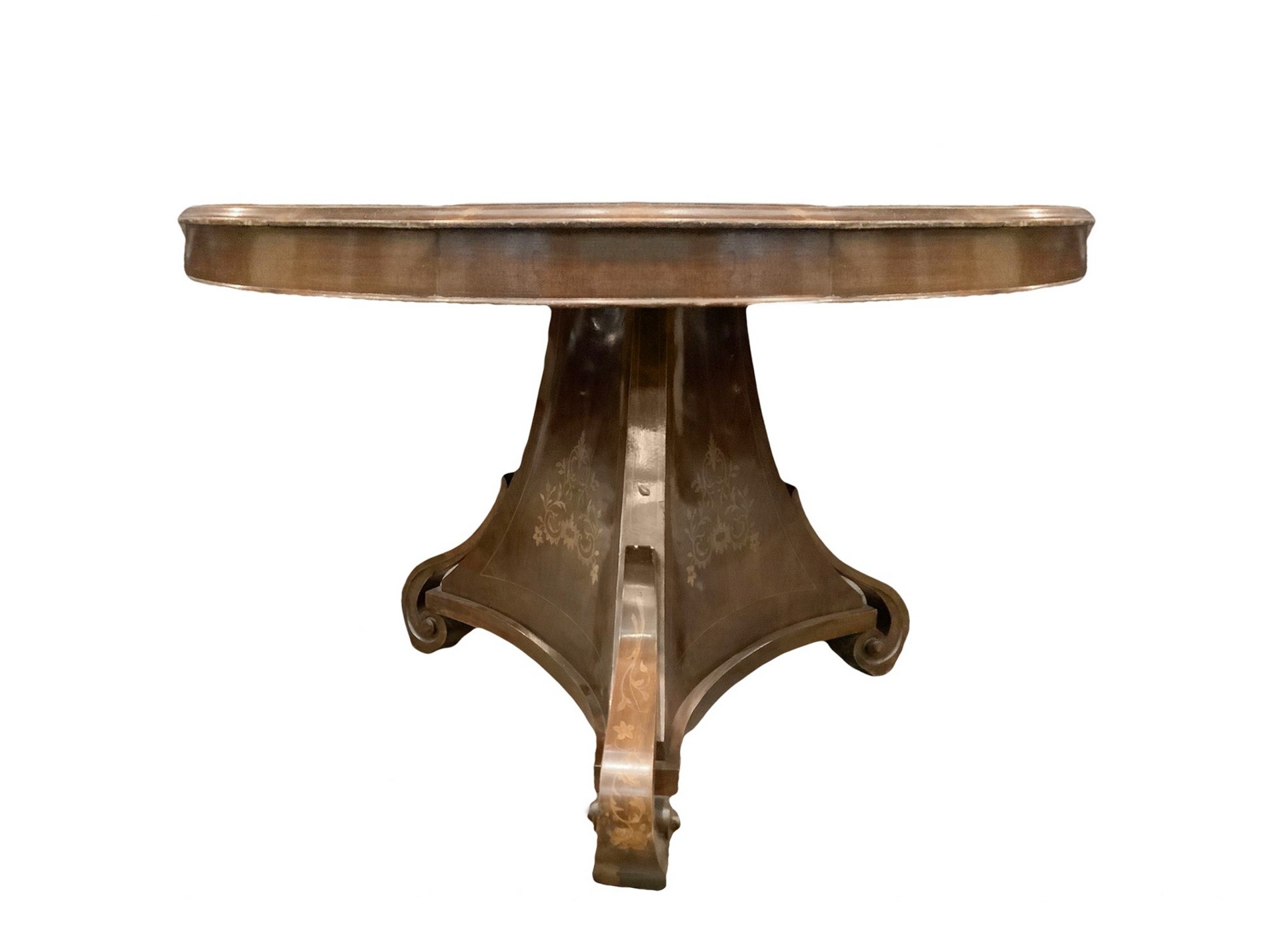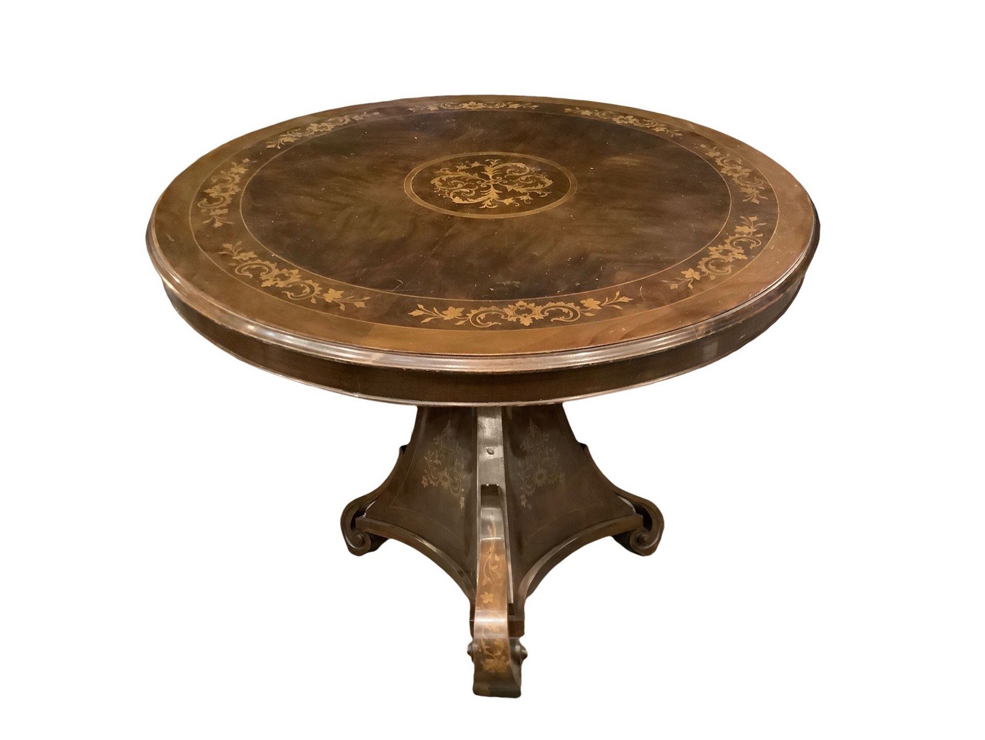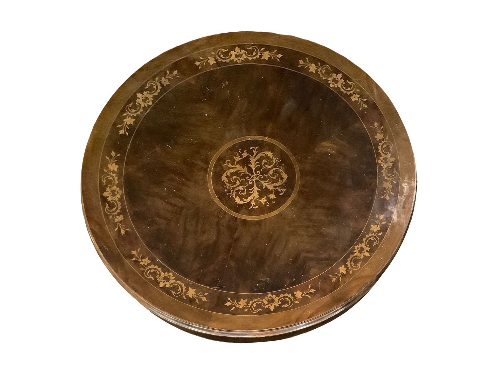 Tavolo rotondo in legno di mogano, Inizi 20° secolo h 80 cm, diametro 118 cm Piede centrale, piano basculante, intarsi sul piano e sulla faccia della base troncopiramidale