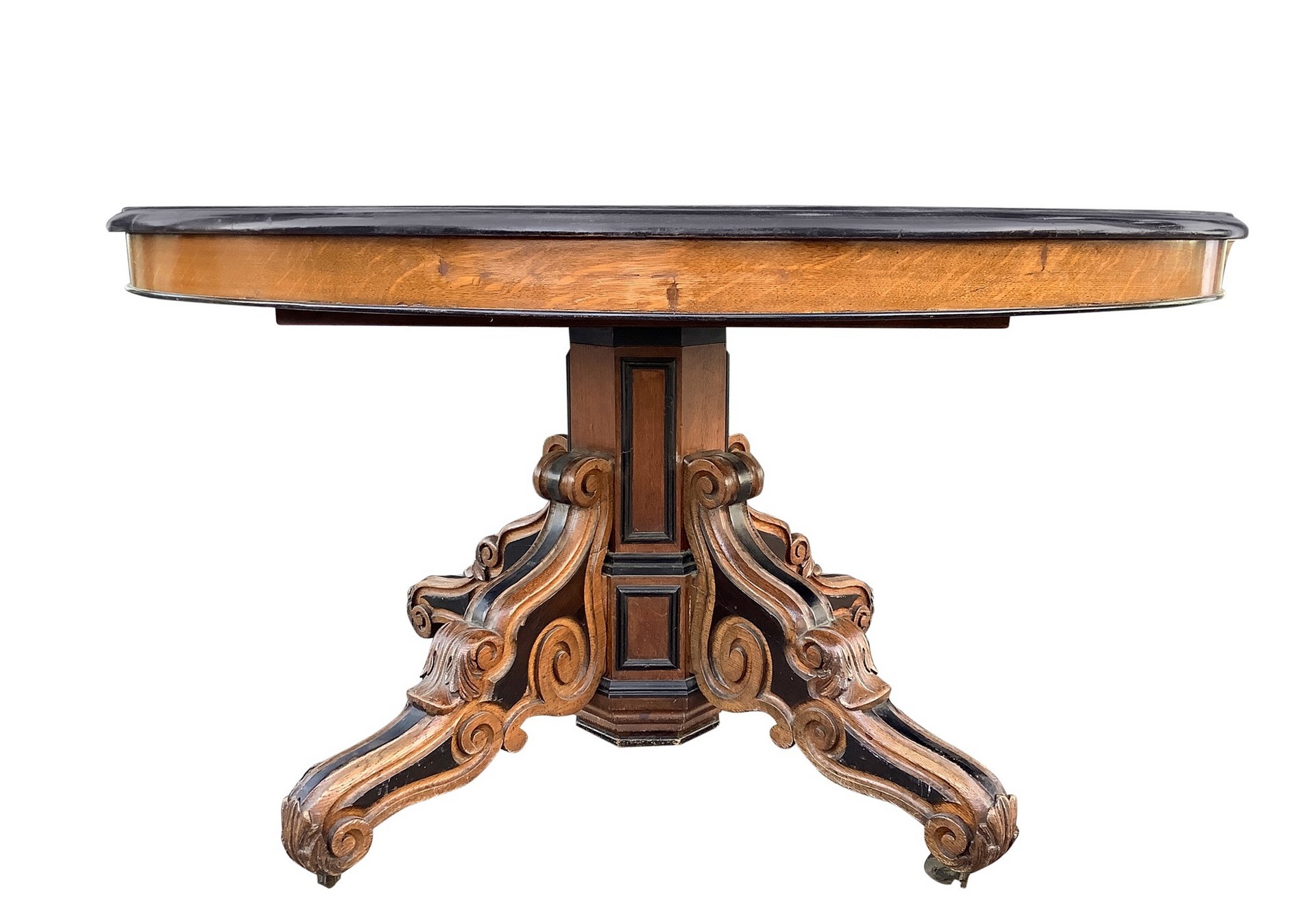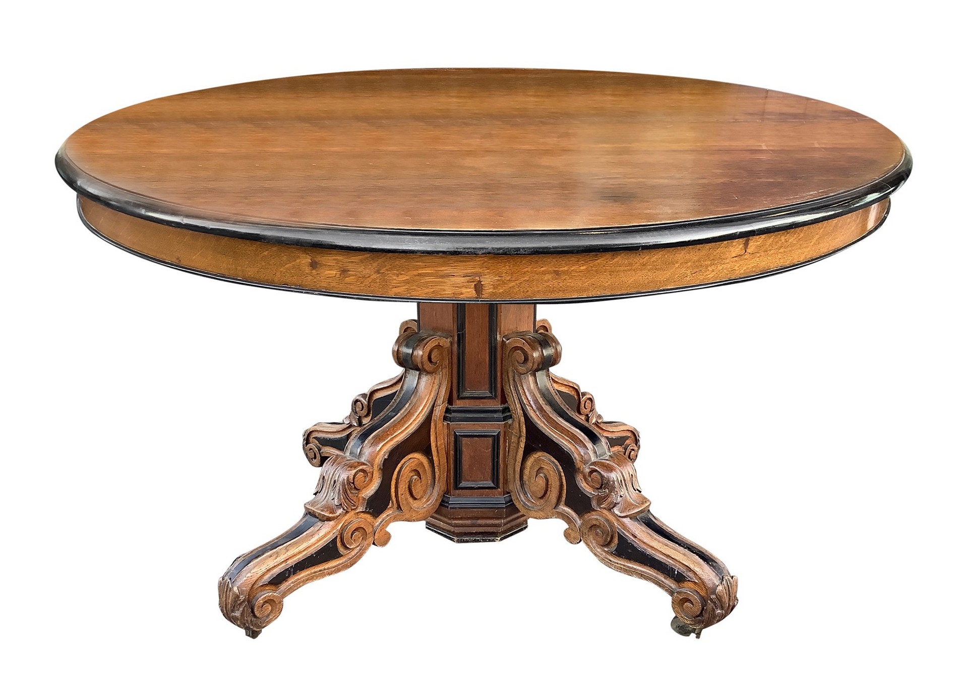tavolo da pranzo, 19° secolo h cm 77x130x145 tavolo allungabile da pranzo in legno di rovere, piede a quattro razze, con perfili ebanizzati. Completo di allunghi n 2. da 25 cm e n. 1 da 50 cm.