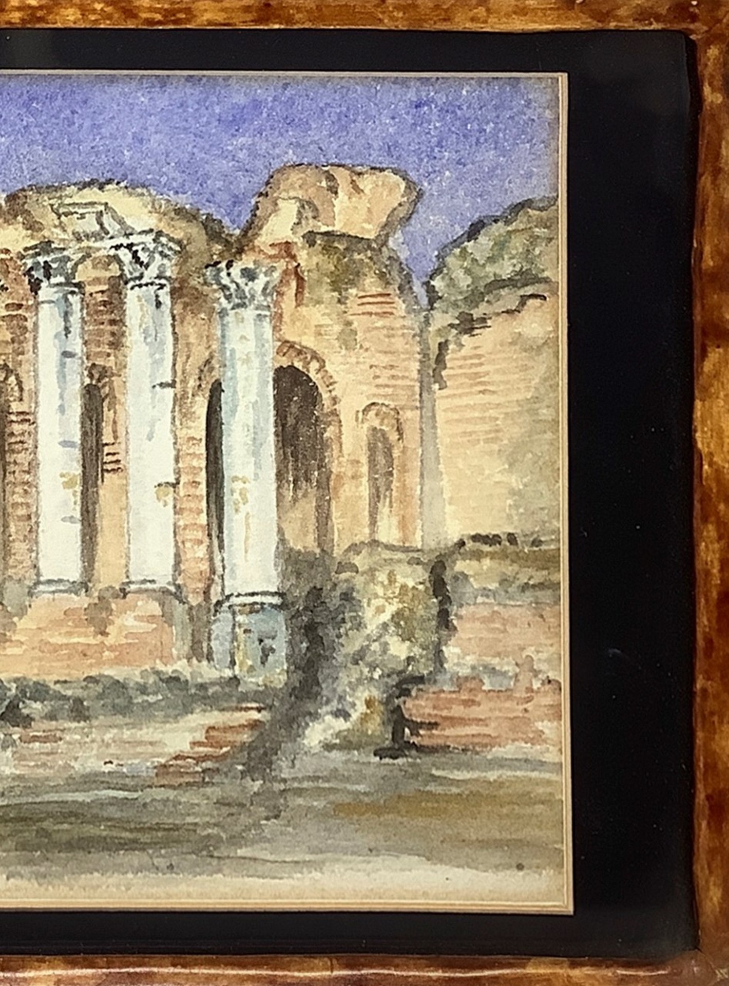 Veduta del teatro greco di Taormina e dell'Etna, Inizi 20° secolo Cm 13x18 guache Pittore inglese.