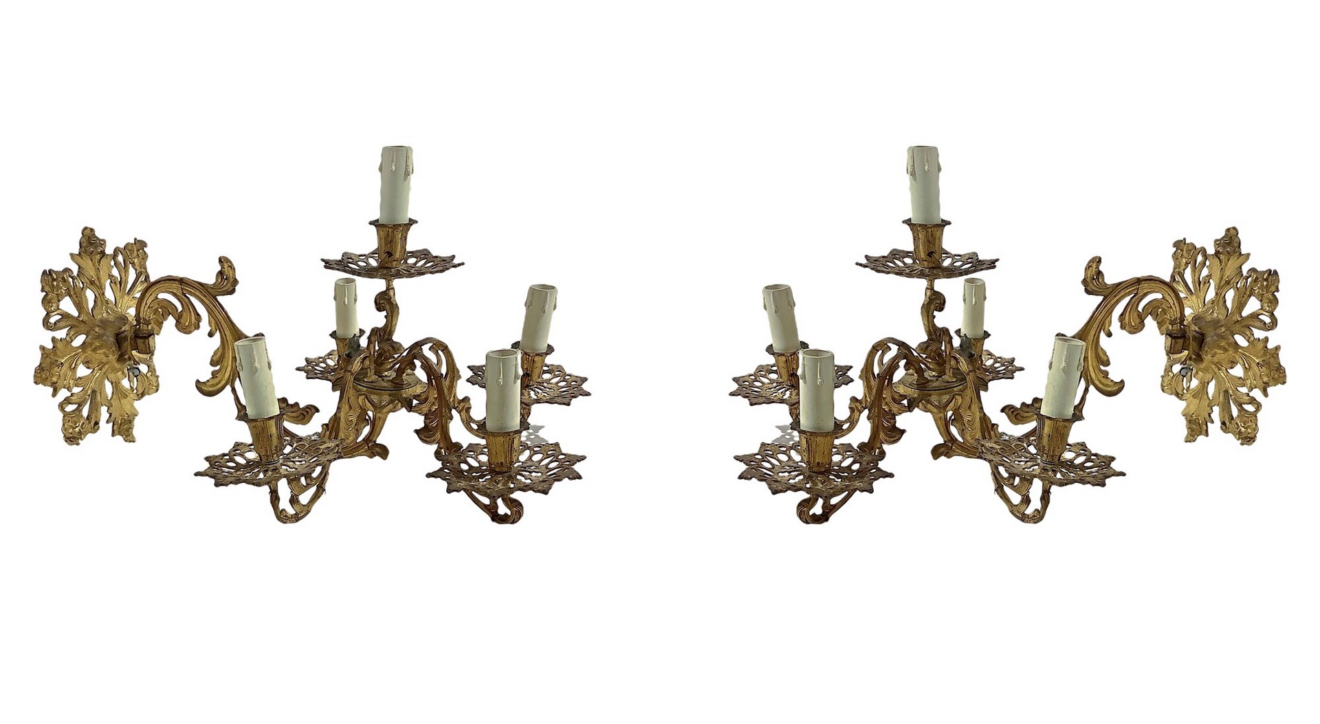 Coppia di applique a cinque luci in bronzo dorato, 19° secolo