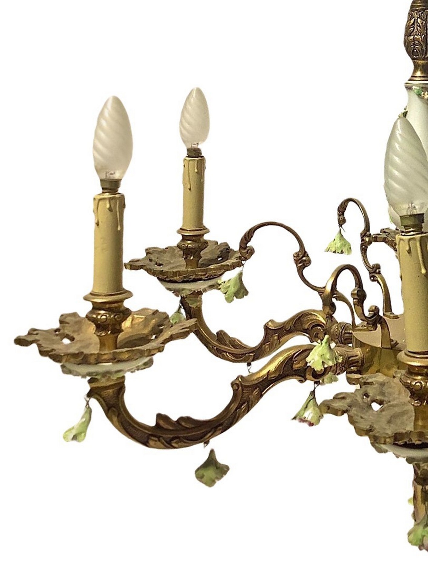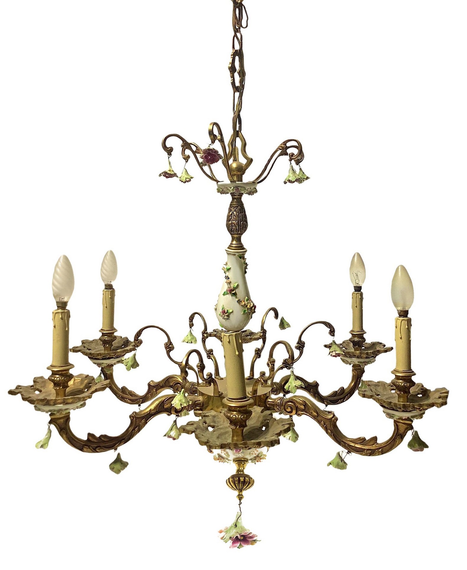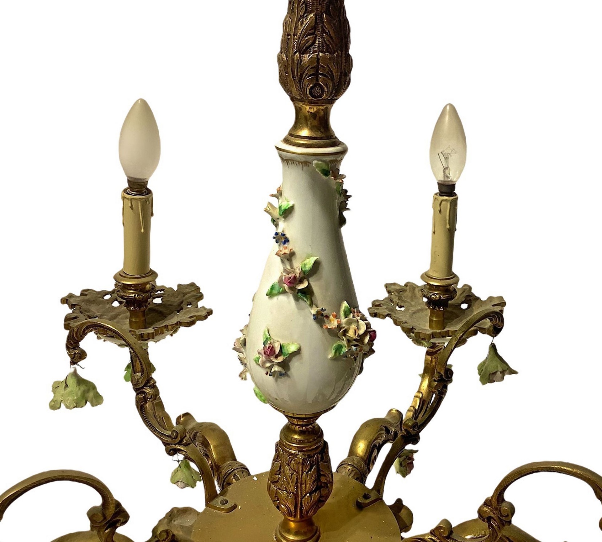 Coppia di lampadari a sei luci h 65 cm, l 75 cm senza catena struttura in metallo con porcellana di Capodimontestruttura in metallo con porcellana di Capodimonte