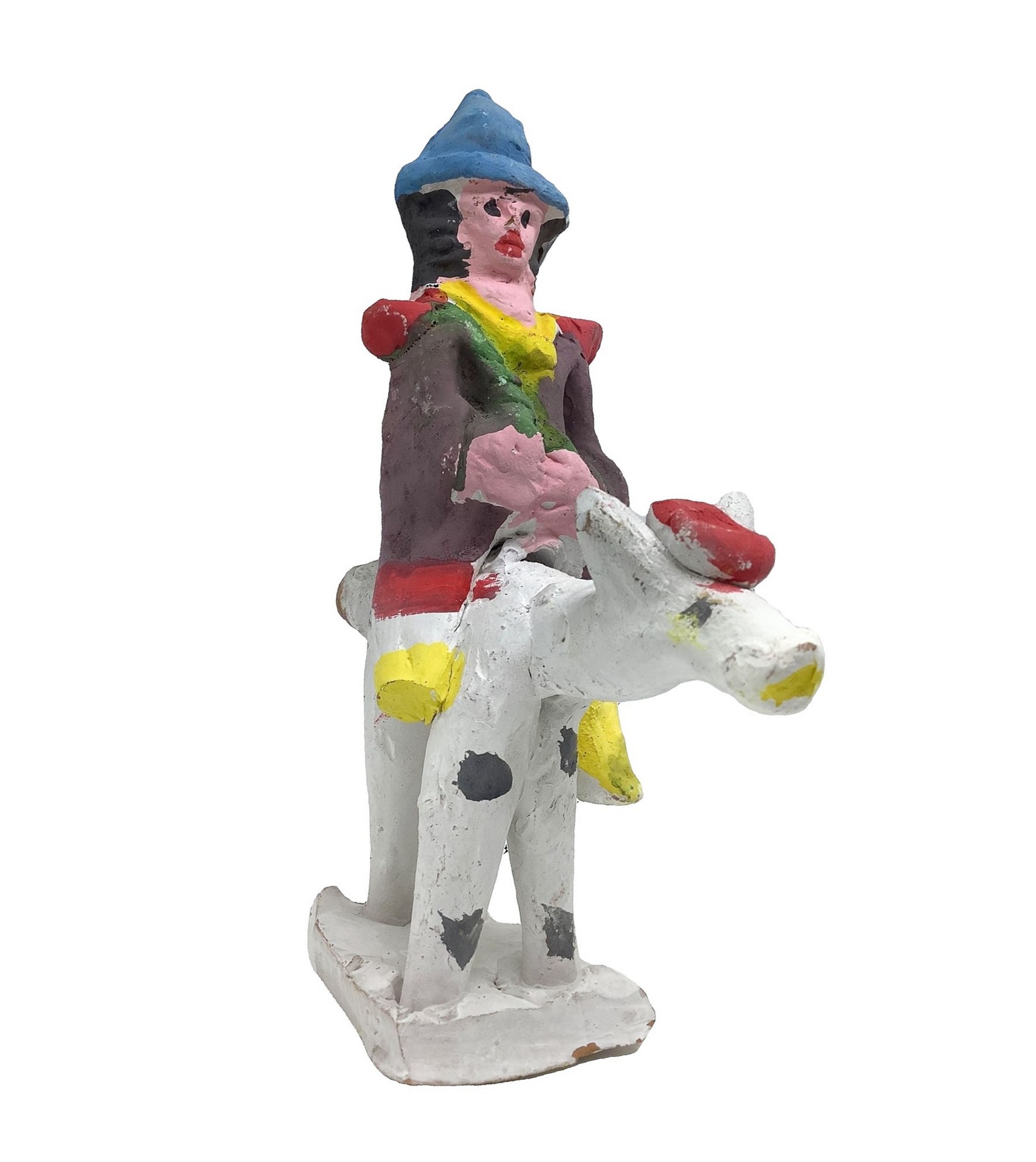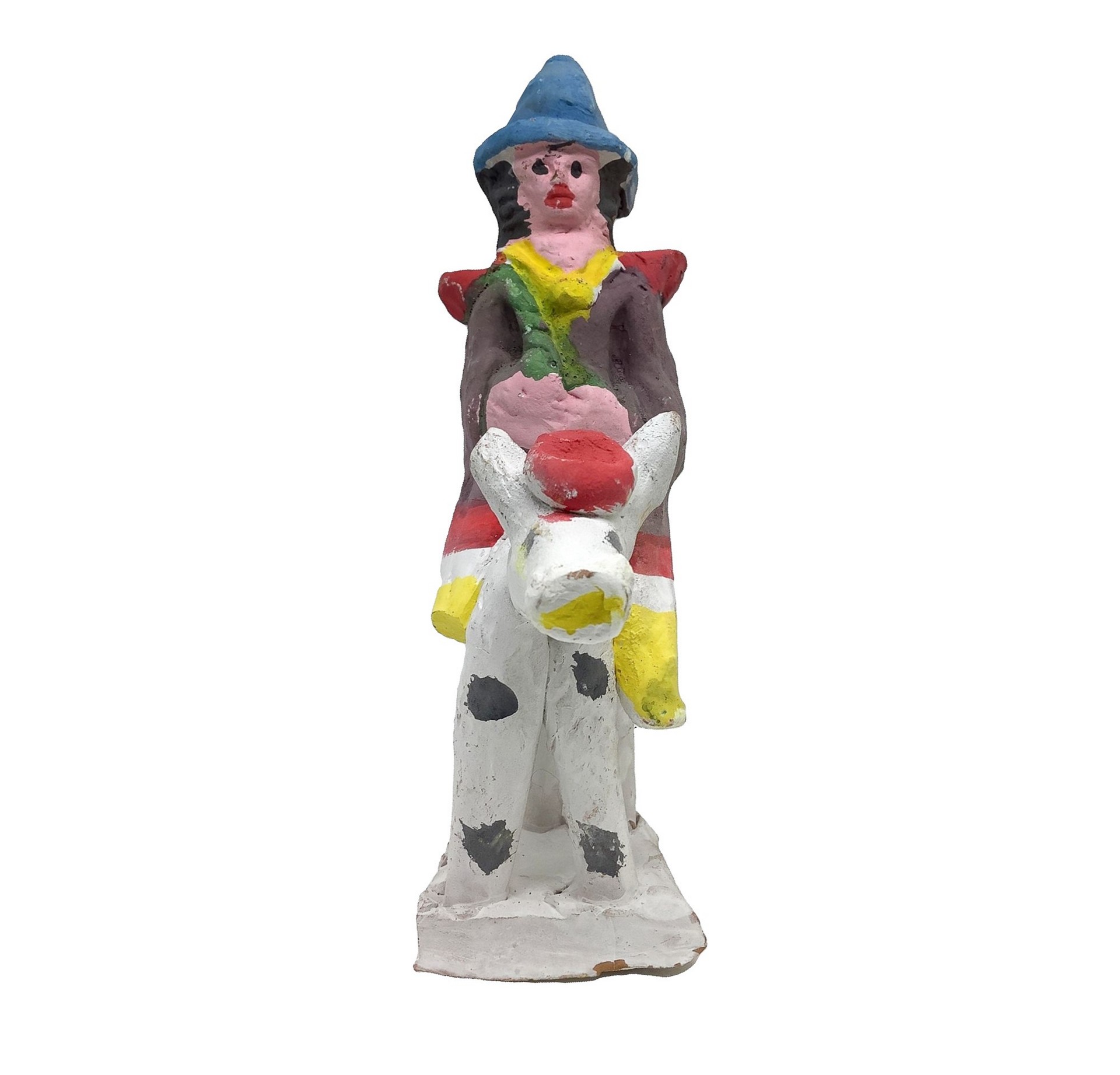 Salvatore Leone - Fischetto policromo in ceramica di Caltagirone di carabiniere a cavallo h 20 cm Salvatore Leone "U Nnacchiareddu" nacque a Caltagirone il 13 Aprile del 1912. Frequentò solo la prima elementare e iniziò a lavorare sin da piccolo come muratore per poi appassionarsi alla lavorazione dell’argilla a partire dai 18 anni presso la bottega dello stovigliaio Mastro Nino Abela. Qui iniziò a realizzare fischietti e personaggi del presepe rispettando severamente la tradizione. Egli prelevava l’argilla dalla contrada San Giorgio, nei dintorni della sua città e inizialmente la lavorava a mano per poi riporla all’interno dei calchi preventivamente cosparsi di calce in polvere per non far aderire l’argilla ai calchi. Infine capovolge delicatamente il calco cosi da far fuoriuscire la figurina che va ritoccata con stecchi di legno e ferro. In questa fase viene attaccato il fischio dalla misura di 2-3 cm con una piccola quantità d’argilla. Dopo aver lasciato asciugare per qualche giorno i fischietti, procedeva con la cottura in una piccola fornace e successivamente le immergeva nel latte di calce e infine li dipingeva. Le sue figure sono realizzate in maniera grossolana e con molta fantasia utilizzando colori puri per attirare l’interesse dei bambini, a cui i fischietti erano destinati. Salvatore Leone "U Nnacchiareddu" nacque a Caltagirone il 13 Aprile del 1912. Frequentò solo la prima elementare e iniziò a lavorare sin da piccolo come muratore per poi appassionarsi alla lavorazione dell’argilla a partire dai 18 anni presso la bottega dello stovigliaio Mastro Nino Abela. Qui iniziò a realizzare fischietti e personaggi del presepe rispettando severamente la tradizione. Egli prelevava l’argilla dalla contrada San Giorgio, nei dintorni della sua città e inizialmente la lavorava a mano per poi riporla all’interno dei calchi preventivamente cosparsi di calce in polvere per non far aderire l’argilla ai calchi. Infine capovolge delicatamente il calco cosi da far fuoriuscire la figurina che va ritoccata con stecchi di legno e ferro. In questa fase viene attaccato il fischio dalla misura di 2-3 cm con una piccola quantità d’argilla. Dopo aver lasciato asciugare per qualche giorno i fischietti, procedeva con la cottura in una piccola fornace e successivamente le immergeva nel latte di calce e infine li dipingeva. Le sue figure sono realizzate in maniera grossolana e con molta fantasia utilizzando colori puri per attirare l’interesse dei bambini, a cui i fischietti erano destinati.
