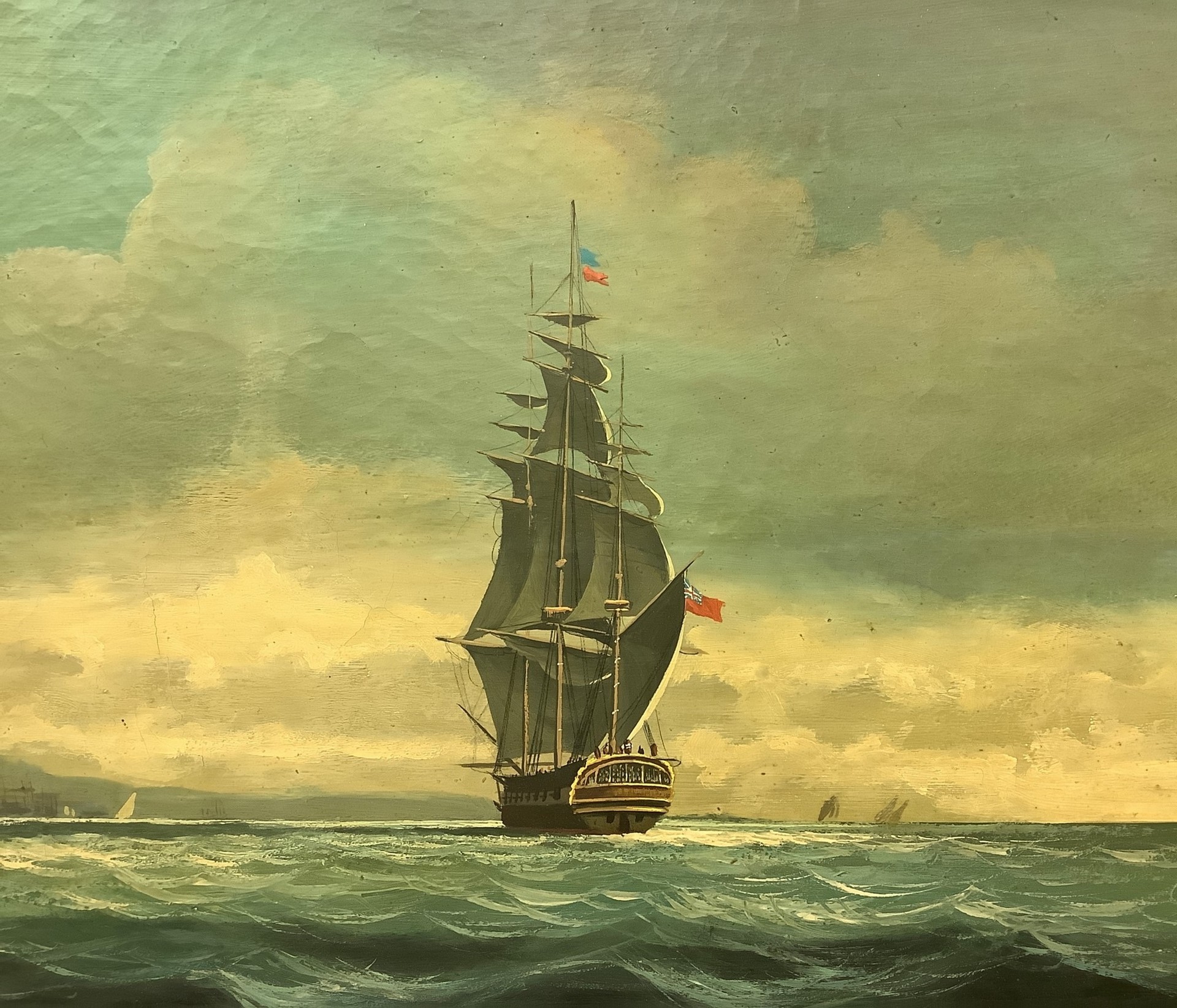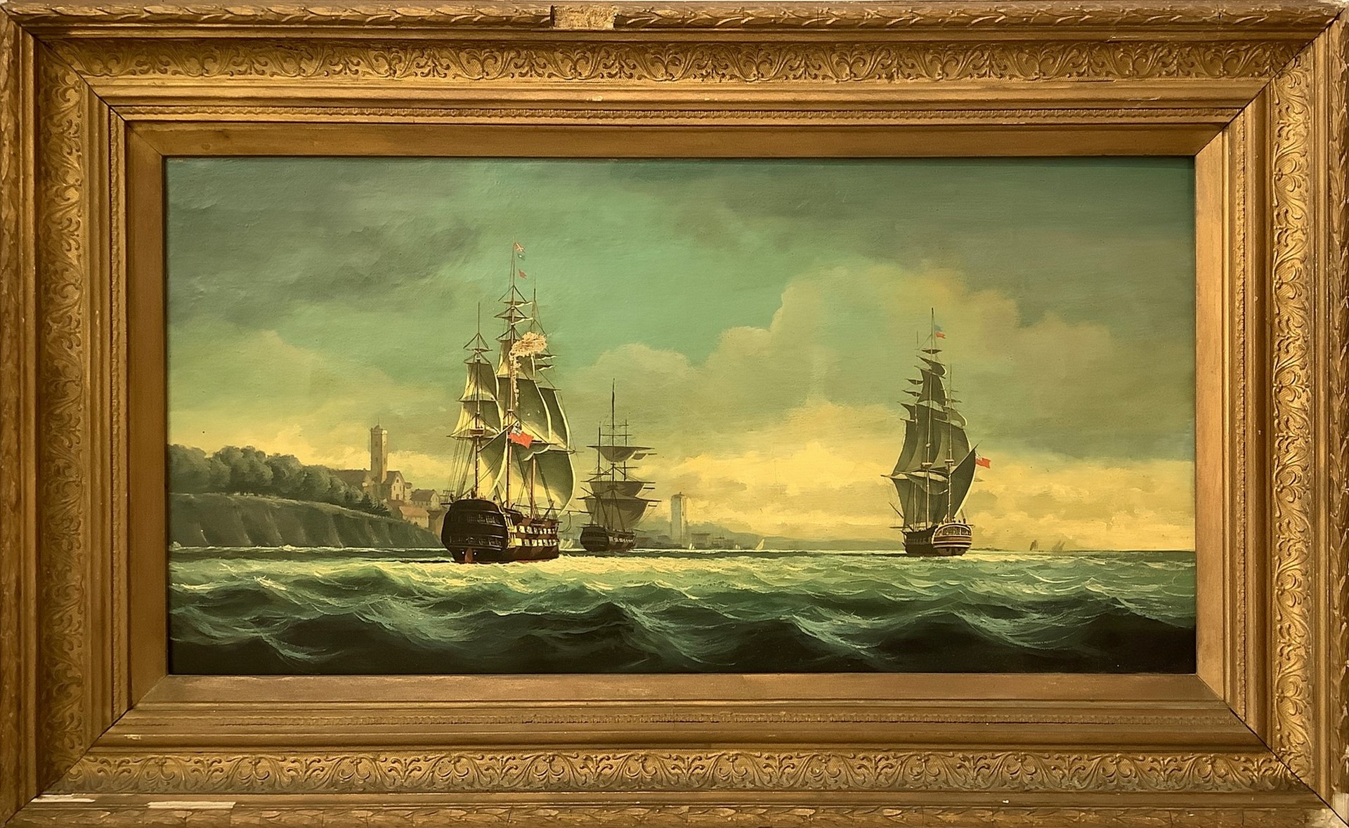 Tre vascelli, Late 19° secolo 25x54 cm, in cornice 47x75 cm Dipinto a olio su tela Presente un danno centrale alla tela.