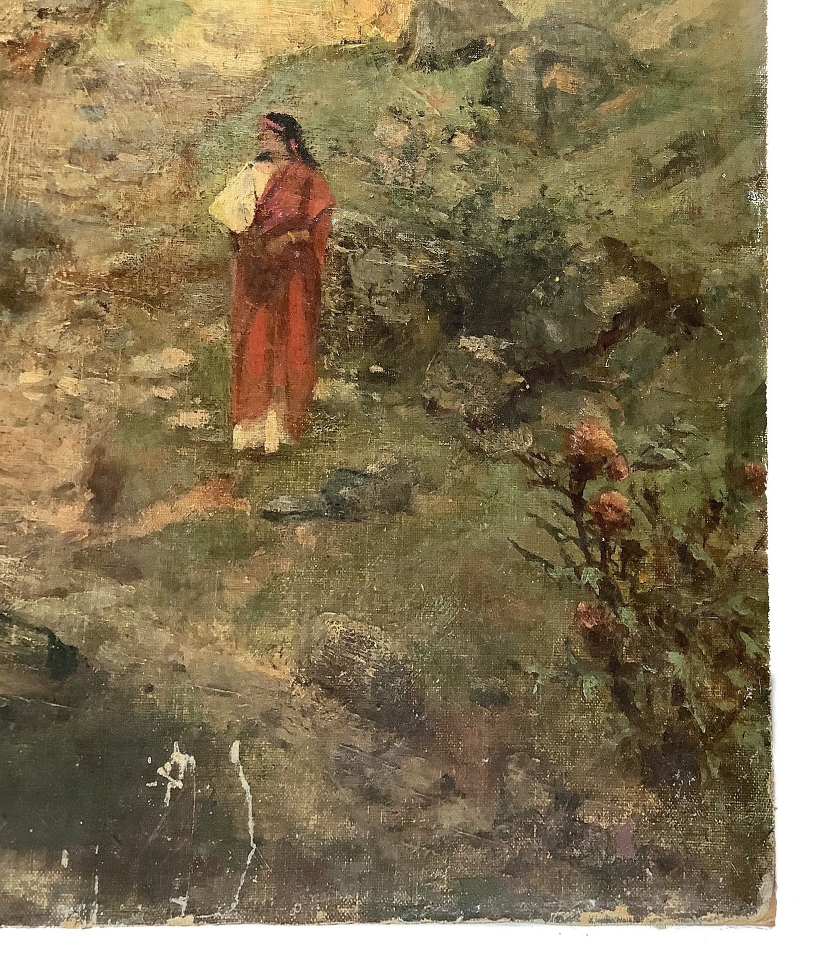 Luigi Di Giovanni (Palermo 1856-Palermo 1938) - Paesaggio con donna in abiti romani, 20° secolo H 65 cm x 49,5 cm. In cornice: H 74 cm x Base 59 cm Dipinto ad olio su tavoletta