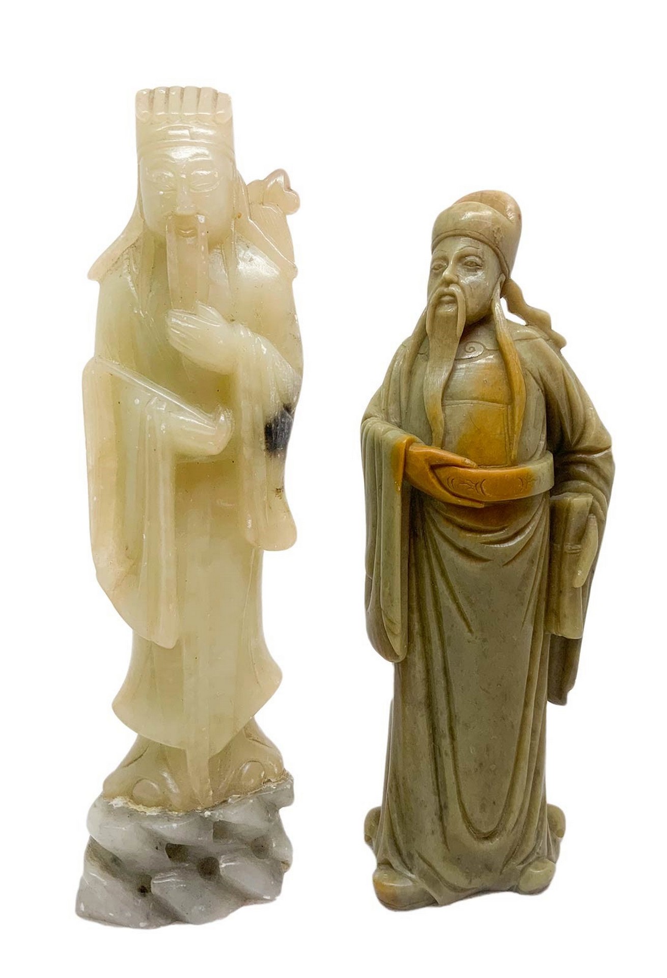 Coppia di statue di saggi, in geolite H cm 17, h cm 18. in geolite. in geolite.