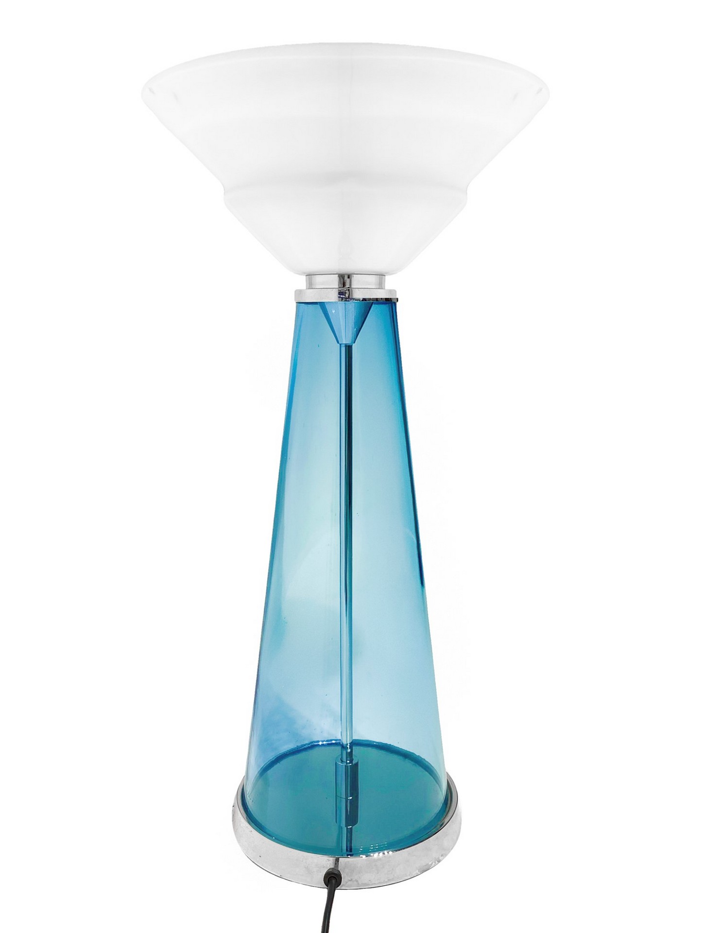 Struttura in metallo cromato, corpo in vetro trasparente di forma tronco-conica nei toni dell’azzurro, diffusore in vetro bianco incamiciato, controdiffusore in vetro satinato