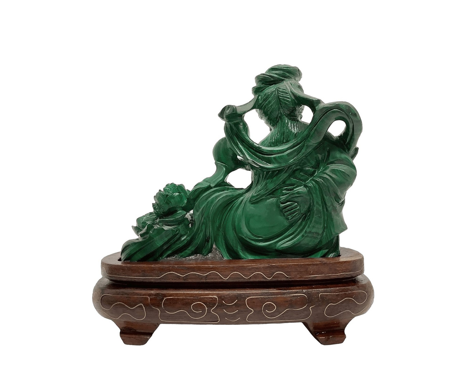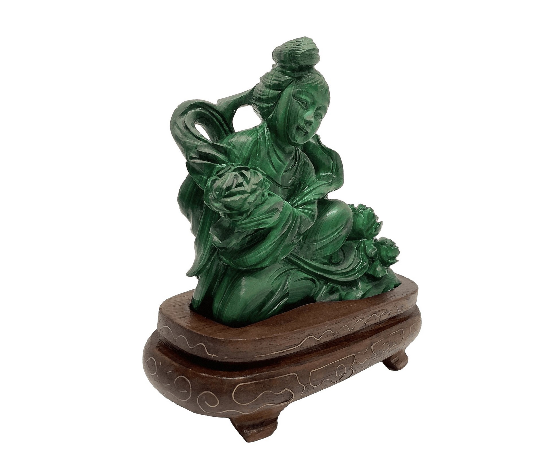 Scultura in malachite raffigurante Guanyin, su base in legno, 20° secolo