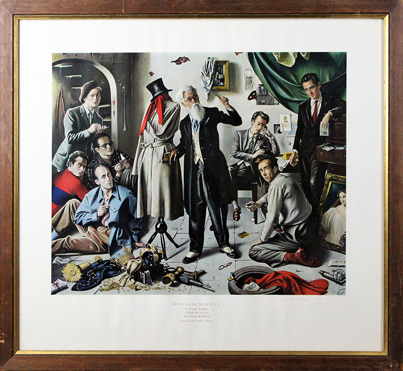 GREGORIO SCILTIAN, "La scuola dei ladri", Stampa con dedica, Dim. 40x45, Al fronte: dedica ad personam e firma in basso a destra, Opera con cornice
