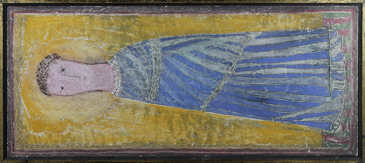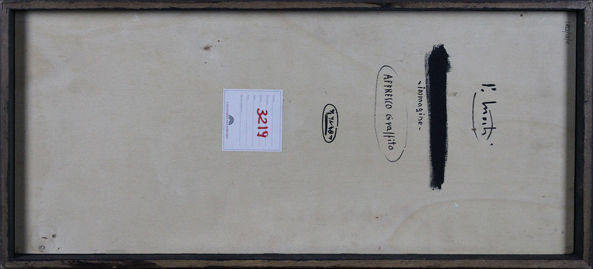 PIERO MOSTI, "Immagine", Affresco graffito su tavola, Dim. 70x30, Al verso: tecnica, titolo, etichetta " Casa d' Arte San Lorenzo" e firma, Opera con cornice