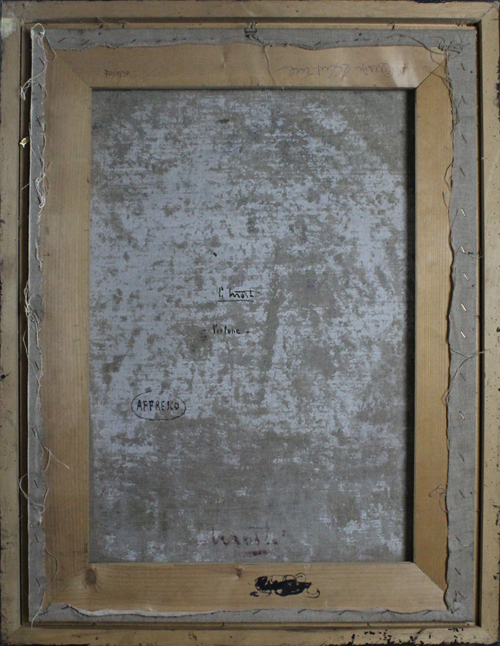 PIERO MOSTI, "Portone", Affresco graffito su tavola, Dim. 80x60, Al verso: titolo, tecnica e firma, Al fronte: firmato in basso al centro, Opera con cornice