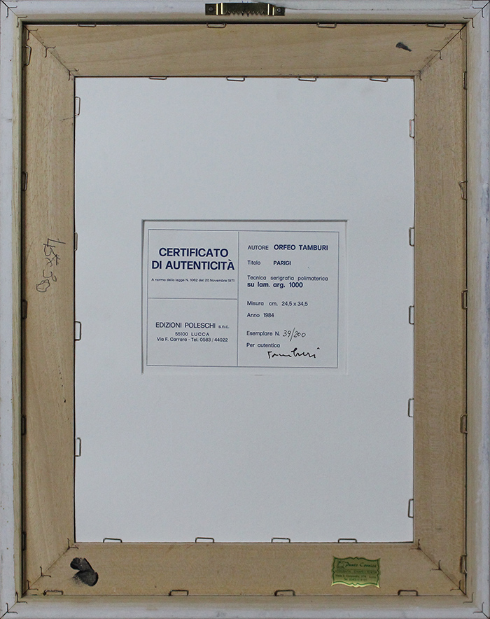 ORFEO TAMBURI, "Parigi", 1984, Serigrafia polimaterica su lam. arg. 1000, Dim. 24,5x34,5, Al verso: certificato di autenticità "Edizione Poleschi" firmato da Tamburi con esemplare n° 39/200, Al fronte: LAM. ARG. 1000 in basso a sinistra e firmato in basso a destra, Opera con cornice