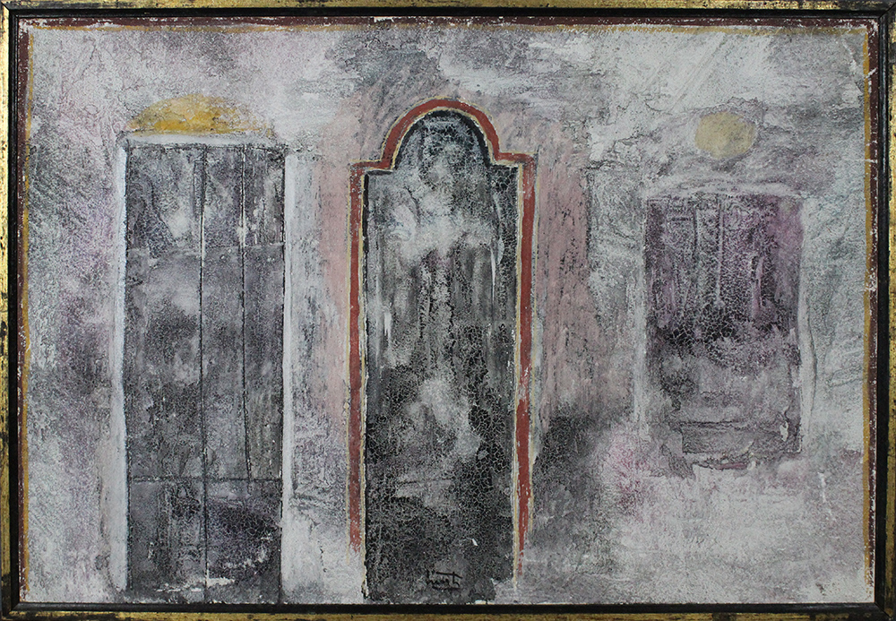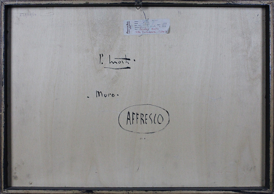 PIERO MOSTI, "Muro", 1998, Affresco graffito su tavola, Dim. 41x61, Opera pubblicata su catalogo Piero Mosti da "Galleria Cappeletti" Milano, Al verso: tecnica, titolo, etichetta "Poleschi Arte" Lucca e firma, Al fronte: firmato in basso al centro, Opera con cornice