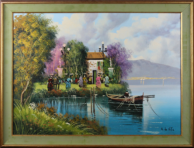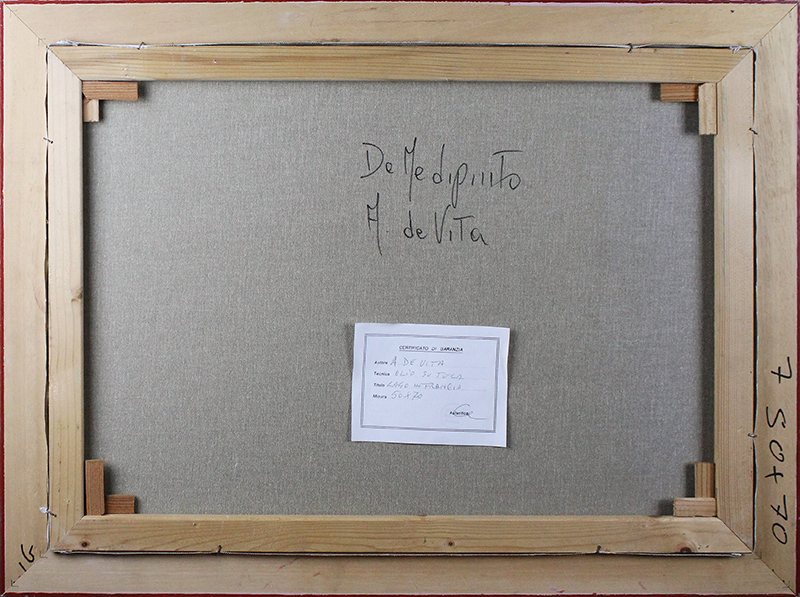 A. DE VITA, "Lago in Francia", Olio su tela, Dim. 50x70, Al verso: certificato di garanzia di "Gallerie associate Italiane", e scritta: "Da me dipinto firmato da A. De Vita", Al fronte: firmato in basso a destra, Opera con cornice