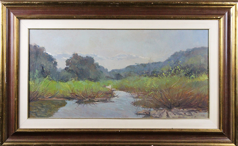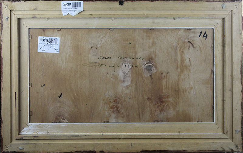 PIETRO TONFONI, "Chioma controluce", 1985, Olio su tavola, Dim. 30x60, Al verso: titolo, data e firma, Al fronte: firmato in basso a destra, Opera con cornice