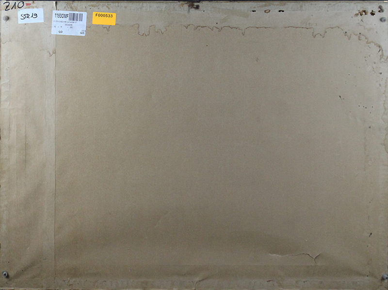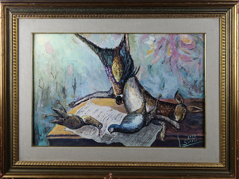 SORESI, "Cacciagione", 1977, Olio su tela, Dim. 39x58, Al fronte: datato e firmato in basso a a destra, Opera con cornice