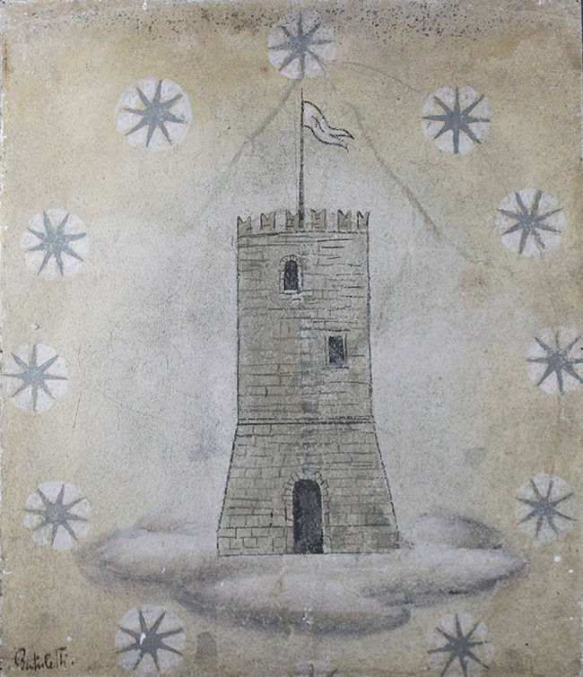 BUTILETTI, "La torre", Tecnica mista su tavola, Dim. 80x67,5, Al fronte: firmato in basso a sinistra, Opera senza cornice