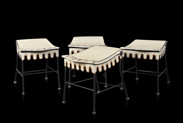 Group of four rare curtain-shaped lacquered iron chairs, convertible into stools (defects)