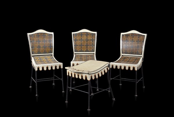 * Gruppo di quattro rare sedie in ferro laccato a finto tendaggio, trasformabil