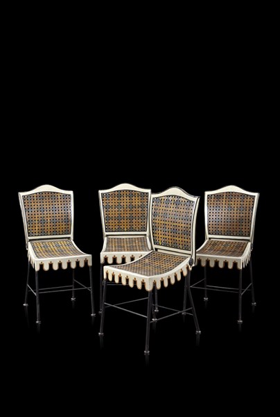 * Gruppo di quattro rare sedie in ferro laccato a finto tendaggio, trasformabili in sgabelli, schienali e sedute traforate in finto cannetté (difetti)