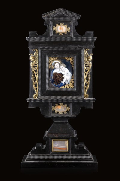 Jacques Laudun II (1663-1729) "Madonna and Child" enamelled plaque in coeval ebonised wooden tabernacle frame with gilded metal friezes and pietre dure (cm 48,5x23,5x8,5) (defects and losses)