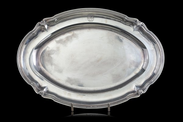 Vassoio in argento con bordo sagomato e costolato decorato a valve di conchiglia e inciso nella tesa con monogramma "EG". Olanda (?), inizio secolo XX, argentiere "LXS" (cm 45x31) (g 1160)