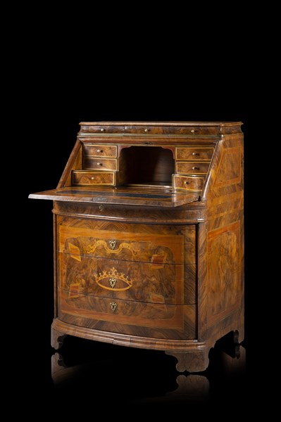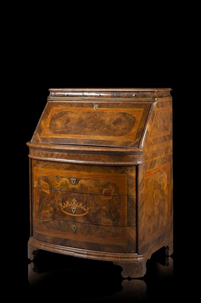 Ribalta impiallacciata e intarsiata in palissandro, radica di noce, radica d'ulivo e bois de rose, decorata da cartelle filettate. Parte superiore con tre tiretti, la calatoia rivela piano in pelle, sei tiretti, vano e segreto. Parte inferiore a tre cassetti sul fronte centrati da cartiglio iscritto col motto nobiliare della famiglia Rospigliosi "OMNIA A DEO" sopra corona principesca. Piedi a mensola. Roma, secolo XVIII (cm 94x122x66) (difetti e restauri)