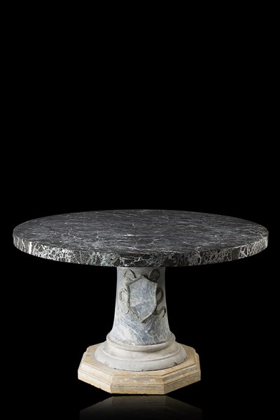 Grande tavolo tondo con piano in marmo rosso levanto, montante in marmo cipollino decorato con stemma. Poggiante su base in pietra e marmo giallo (d. cm 145 x h. cm 85) (difetti)