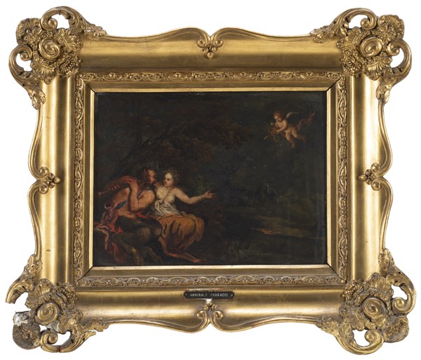 Scuola dell'inizio del secolo XVII Ninfa e Satiro Olio su lavagna, cm 25,5x33,