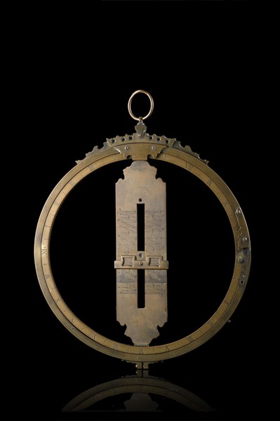 Orologio solare ad anello equinoziale universale in ottone. Struttura formata da due anelli concentrici di cui quello esterno "del meridiano" con sospensione ad anello e interno "delle ore". Barra con scala di declinazione, segni dello zodiaco e mesi. Parte superiore con monogramma "M V 1757". Probabile Germania, XVIII secolo (d. cm 18)