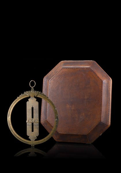 18th-century German brass solar clock formed by two concentric rings. Monogram "M V 1757" incribed on the upper part of the bar (d. cm 18) In leather case of later period
