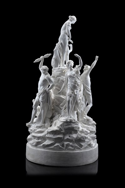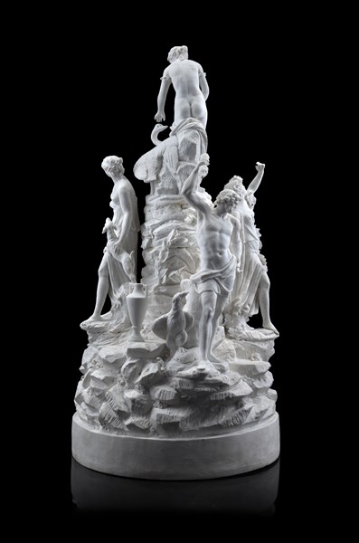 Manifattura di Locrè, Parigi, fine del secolo XVIII "Trionfo di Leda" gruppo in biscuit raffigurante Zeus con l'aquila e la saetta nella mano destra, Artemide con il cane a lei sacro, Ermes con il petaso alato e Afrodite, sormontati da Leda e il cigno poggianti su roccia (cm 22x48x22) (difetti e piccole mancanze)