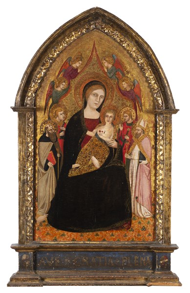 Scuola toscana del secolo XV Madonna con Bambino e santi Olio su tavola, cm 70