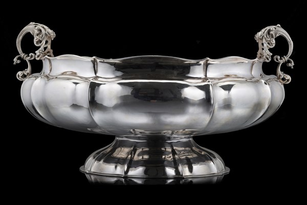 Grande alzata centrotavola in argento con bordura di forma sagomata. Anse a vol