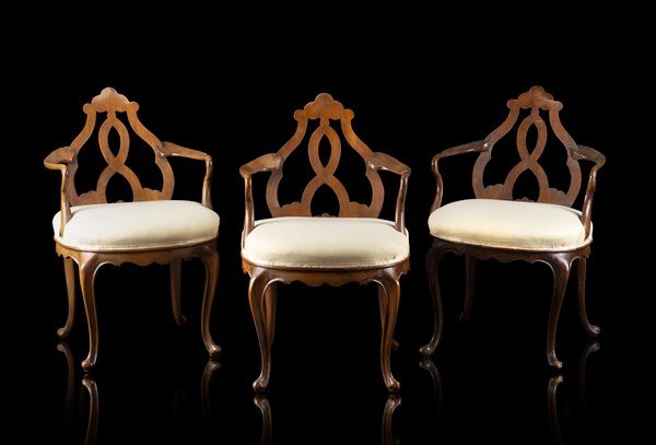 Gruppo di tre rare poltroncine in noce con gambe e braccioli mossi e schienale sagomato e traforato. Veneto, secolo XVIII (difetti e restauri)