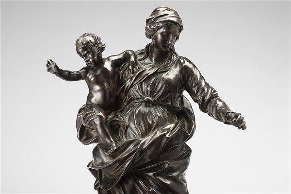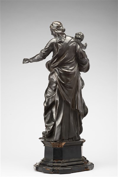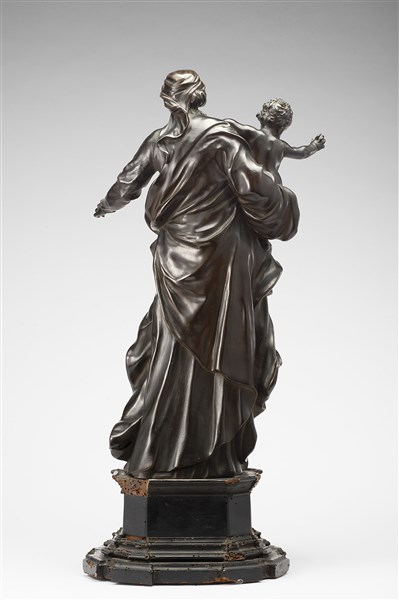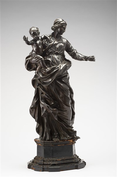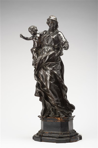 Algardi Alessandro "Madonna con Bambino" gruppo in bronzo poggiante su base coev