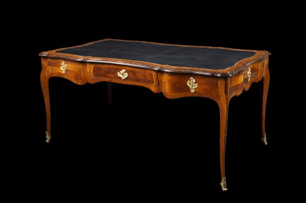 Il mobile è un interessante esempio di alta qualità, raro per le grandi dimensioni, dell’ebanisteria genovese della metà del ‘700, chiaramente derivato dai bureau plat parigini di ebanisti come BVRB o Jacques Dubois che avevano aggiornato il modello di scrivania ideato alcuni decenni prima da André Charles Boulle. Gli esemplari genovesi spesso si distinguono solo per la maggiore sobrietà della decorazione bronzea e per i legni utilizzati per la struttura e gli interni dei cassetti, diversi da quelli francesi.